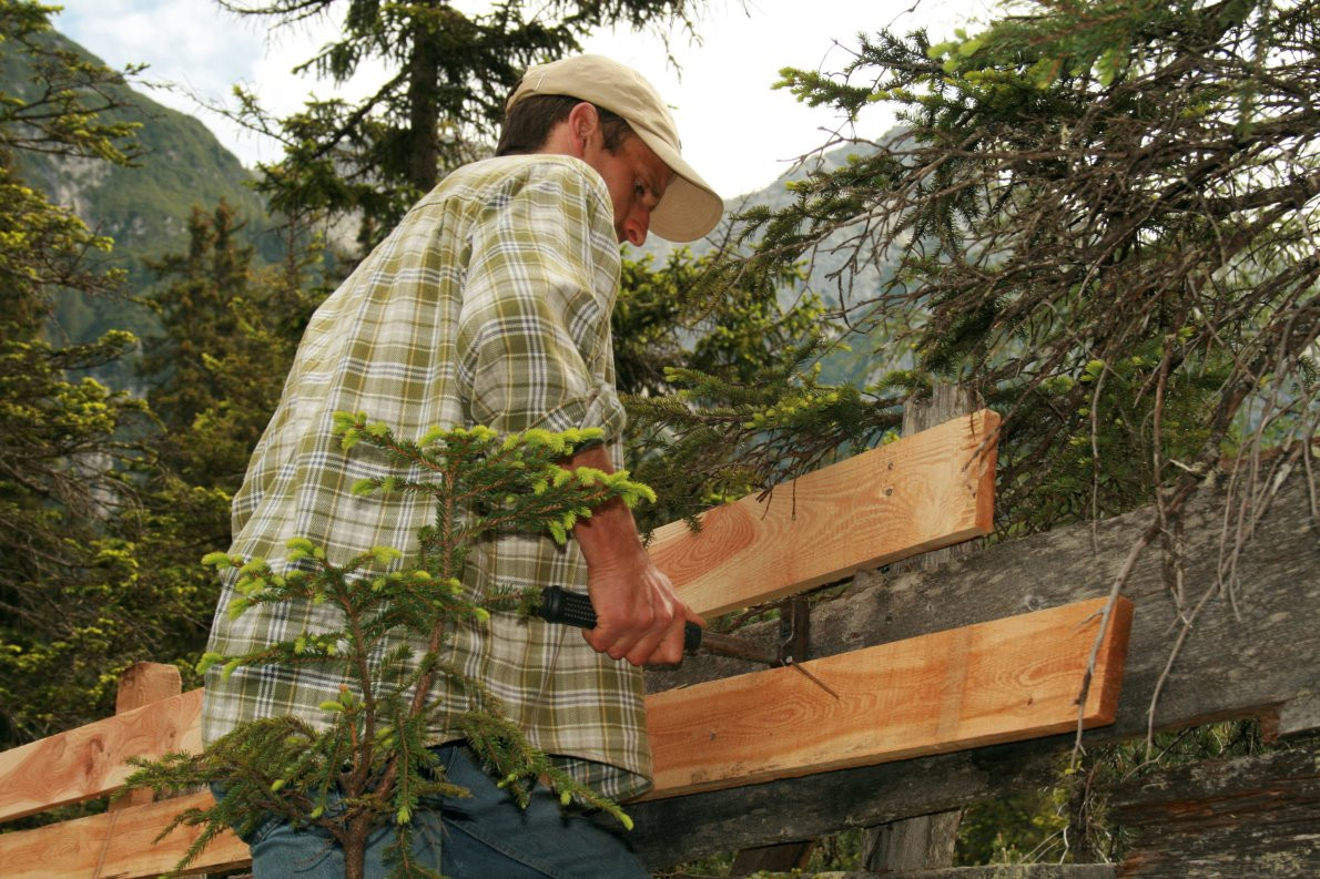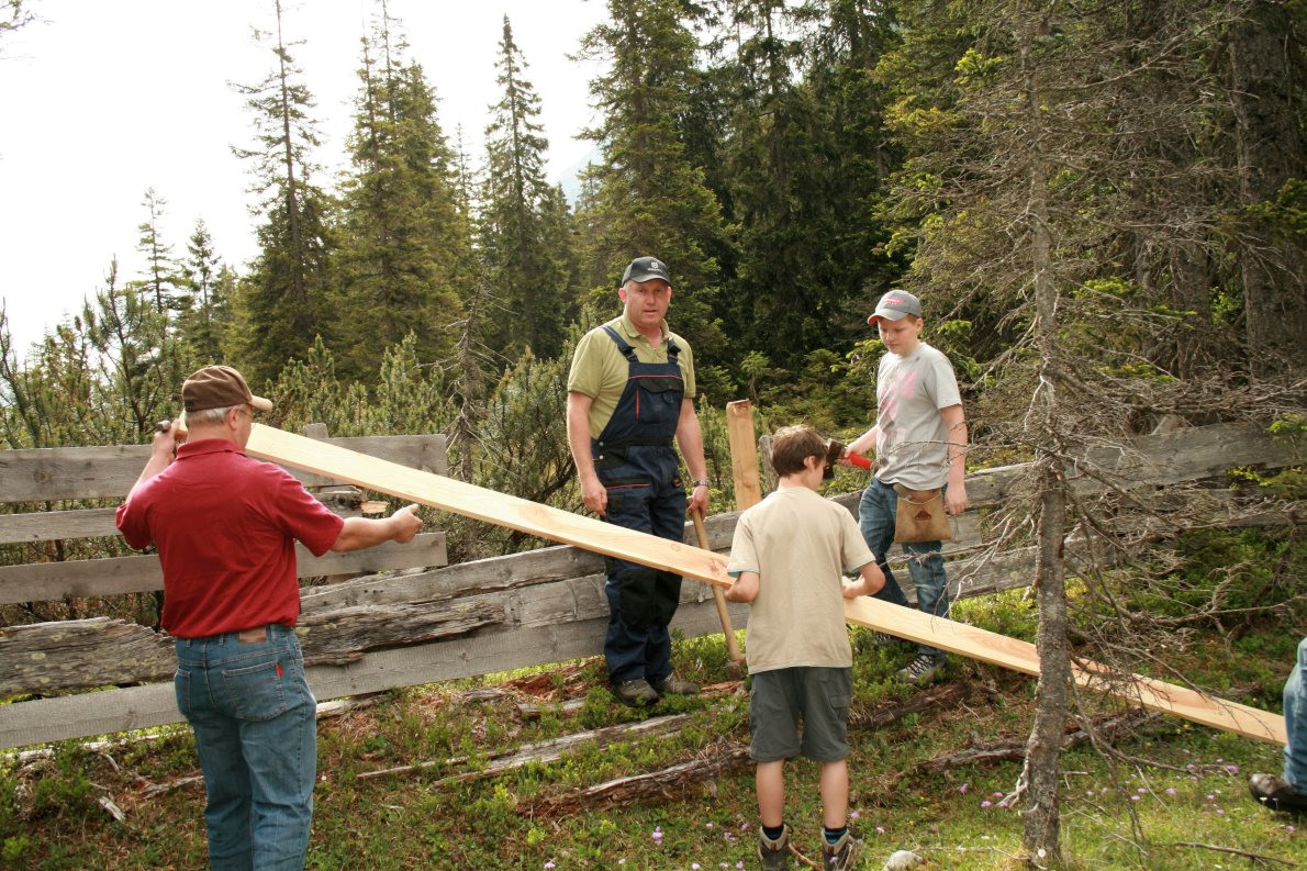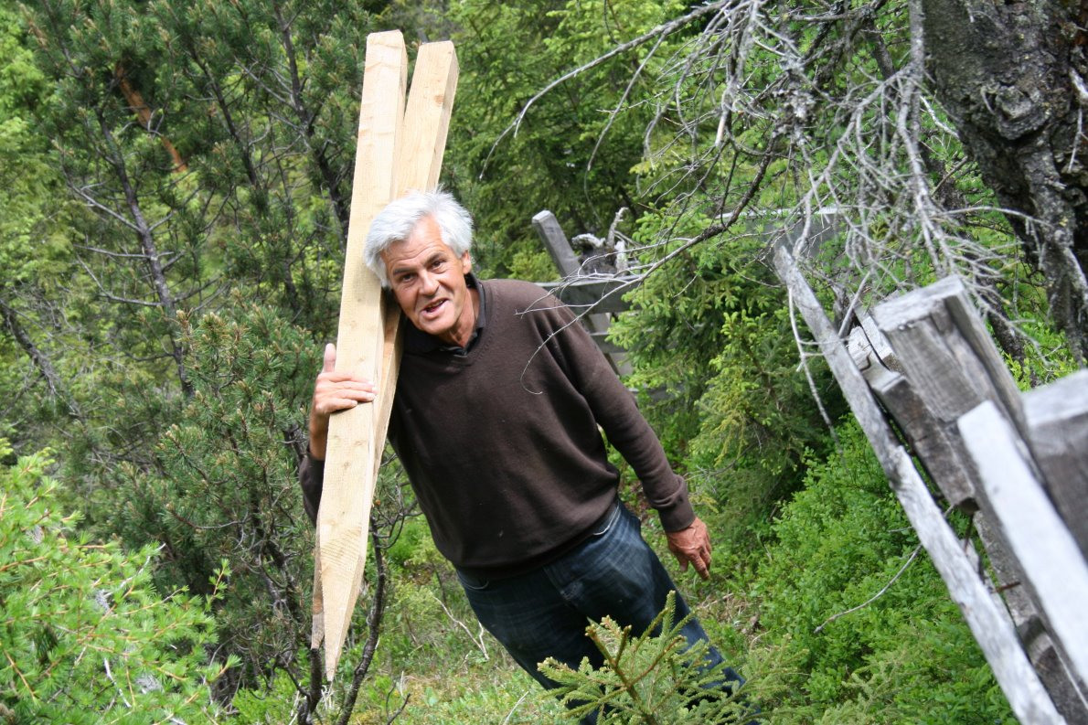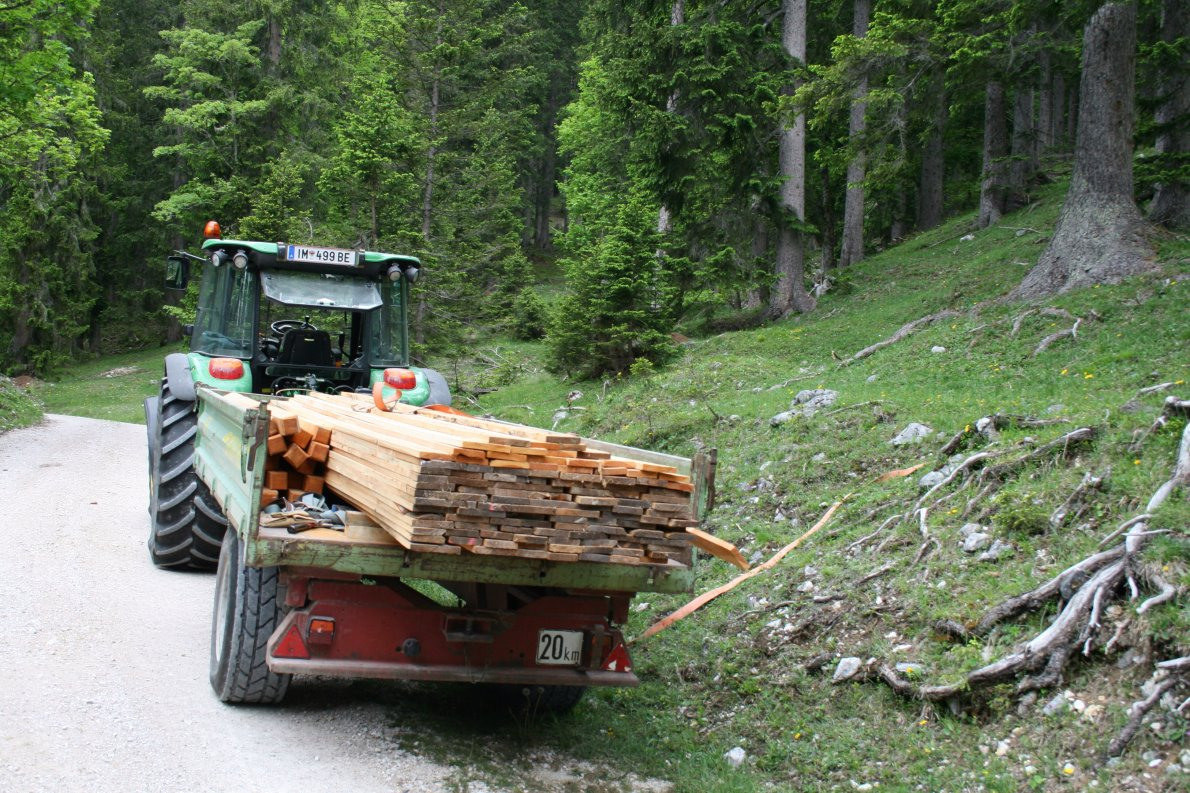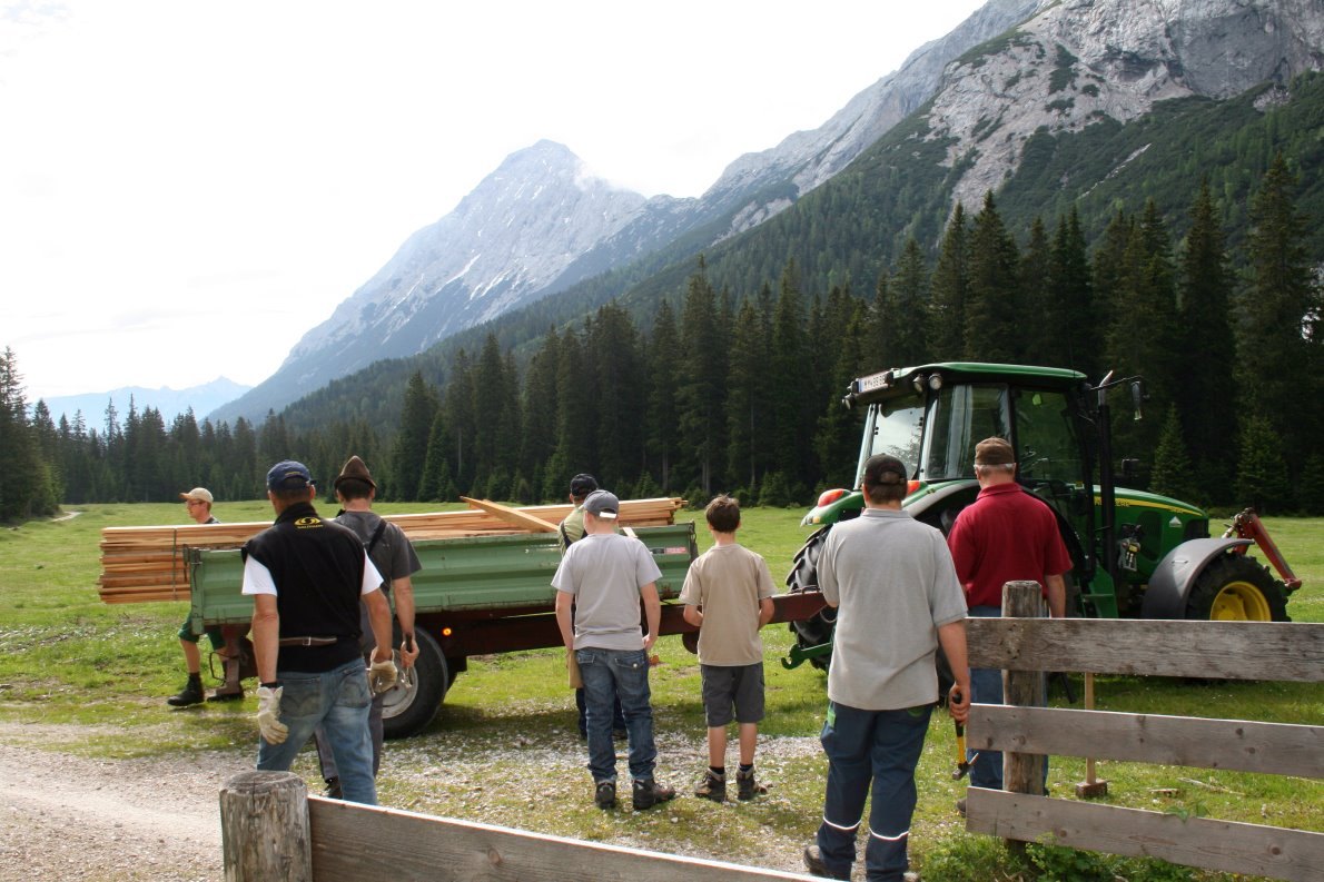 Einer uralten Vereinbarung folgend, sind die Mieminger für das „Zäunen“ zuständig. Dazu muss erst Holz aus den eigenen Wäldern geschlagen und geschnitten werden. Die Bretter und Pfähle bringt der Traktor auf die Alm. Heuer war das die Arbeit von Andi Scharmer.
