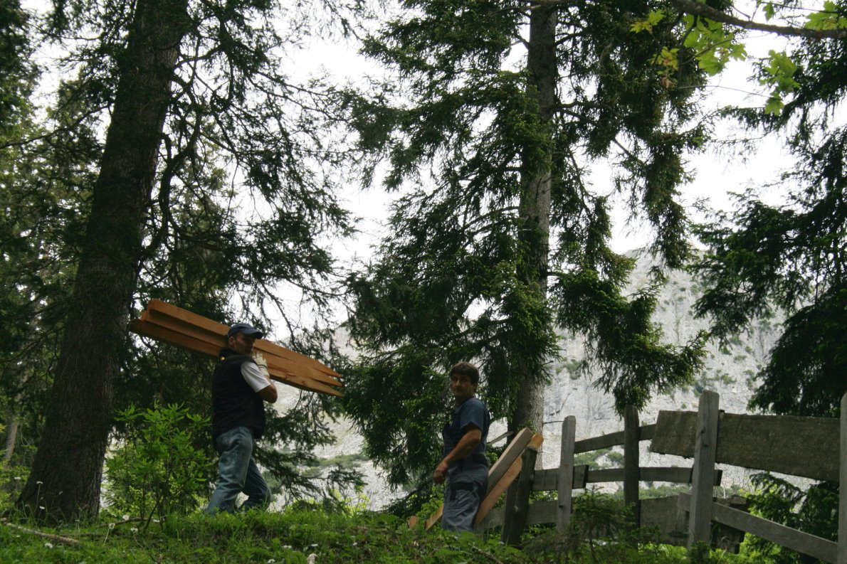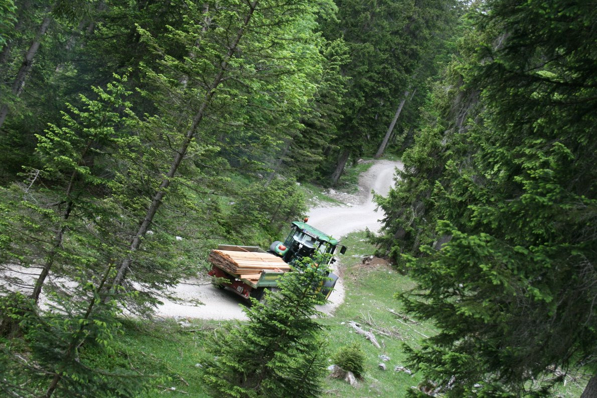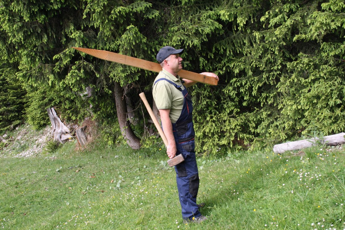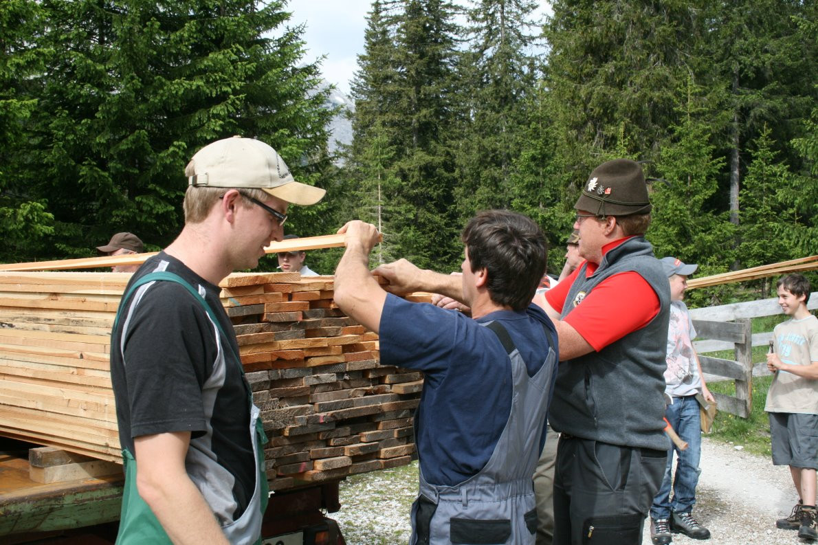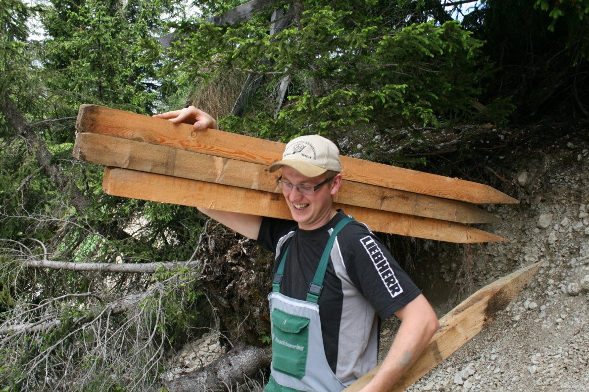Einer uralten Vereinbarung folgend, sind die Mieminger für das „Zäunen“ zuständig. Dazu muss erst Holz aus den eigenen Wäldern geschlagen und geschnitten werden. Die Bretter und Pfähle bringt der Traktor auf die Alm. Heuer war das die Arbeit von Andi Scharmer.