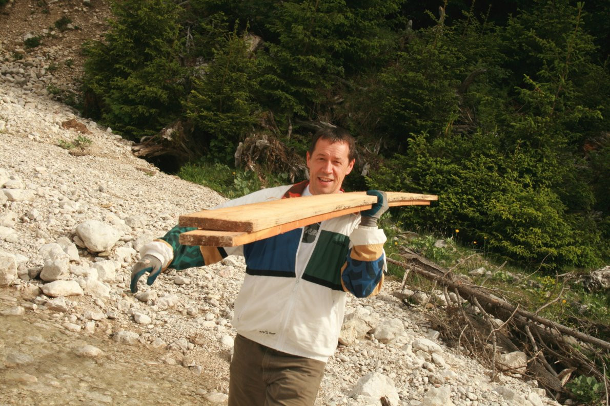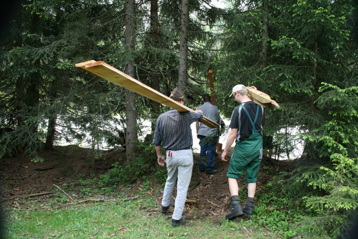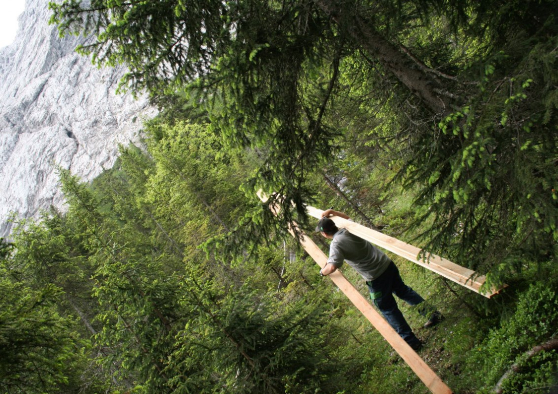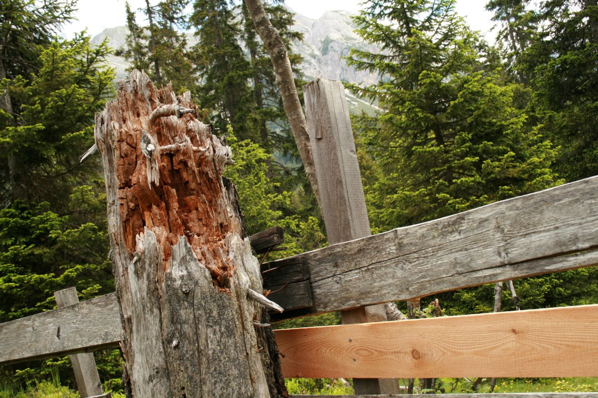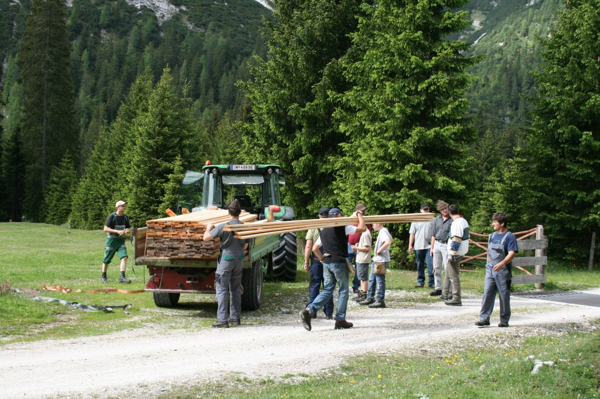 Einer uralten Vereinbarung folgend, sind die Mieminger für das „Zäunen“ zuständig. Dazu muss erst Holz aus den eigenen Wäldern geschlagen und geschnitten werden. Die Bretter und Pfähle bringt der Traktor auf die Alm. Heuer war das die Arbeit von Andi Scharmer.