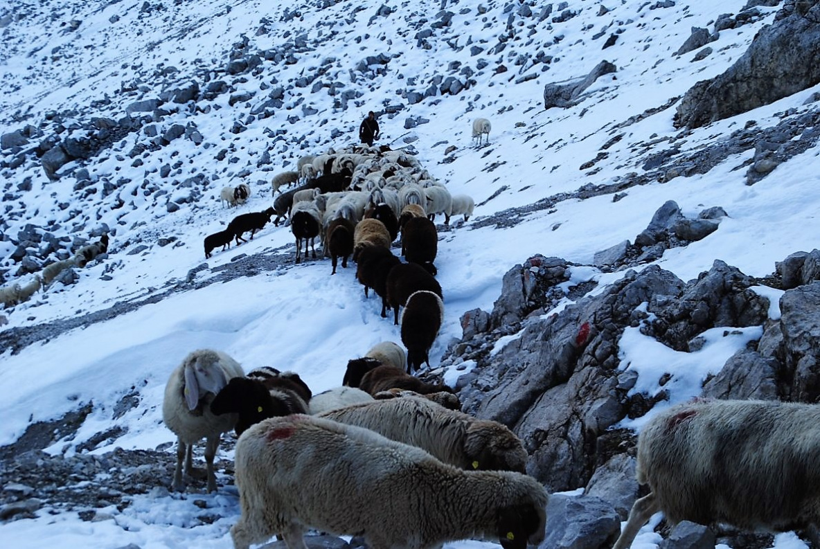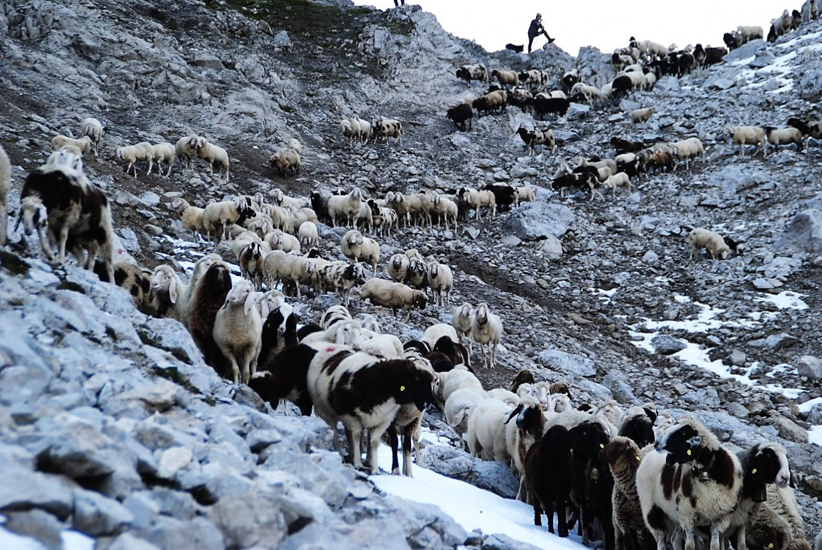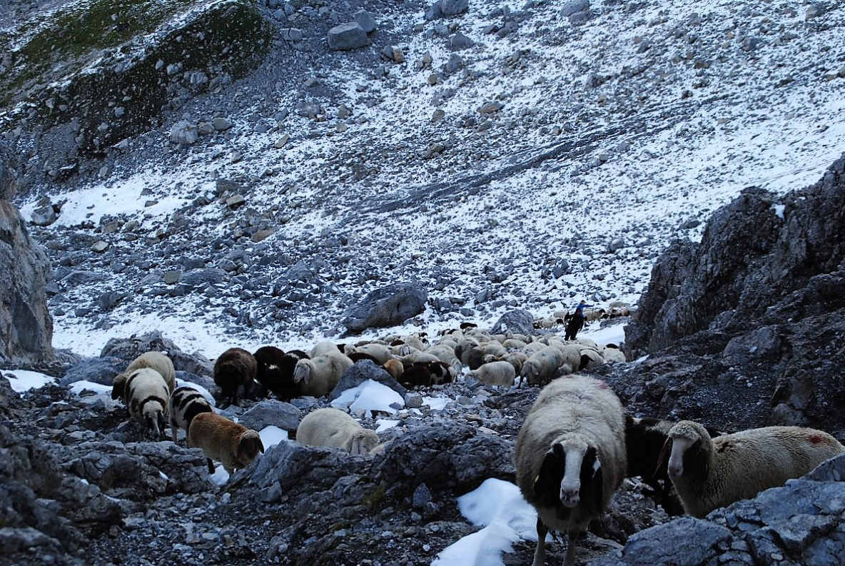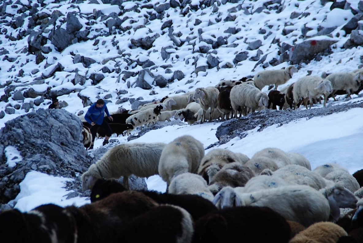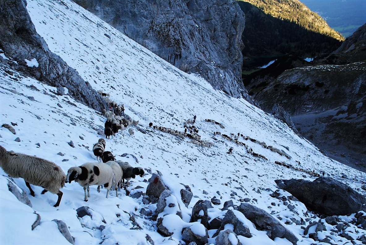 Der Tross setzt sich ruhig und konzentriert in Bewegung. Der Aufstieg zur 1917 Meter hoch gelegenen Coburger Hütte, vorbei am Drachensee (ca. 2000 Meter über Seehöhe), hoch zur 2272 Meter hohen Grünsteinscharte in der Mieminger Kette, ist zwar beschwerlich, geht aber zügig voran. Die Grünsteinscharte war bis kurz vor der Schafschoad wegen Steinschlags geschlossen. Ein neuer Pfad wurde angelegt, der zwar sehr gut ist, aber höchste Konzentration erfordert. Für Mensch und Tier. Auf dem Weg zum Drachensee überquert die Herde ein großes Schneefeld. Die Temperaturen liegen konstant im Minus-Bereich. Jeder Schritt ist gefährlich. Das Tiroler Bergschaf ist absolut alptüchtig, wie die Experten sagen. Das heißt, das Klauentier ist steig- und trittsicher. Vergleichbar, beispielsweise, mit der Gams.