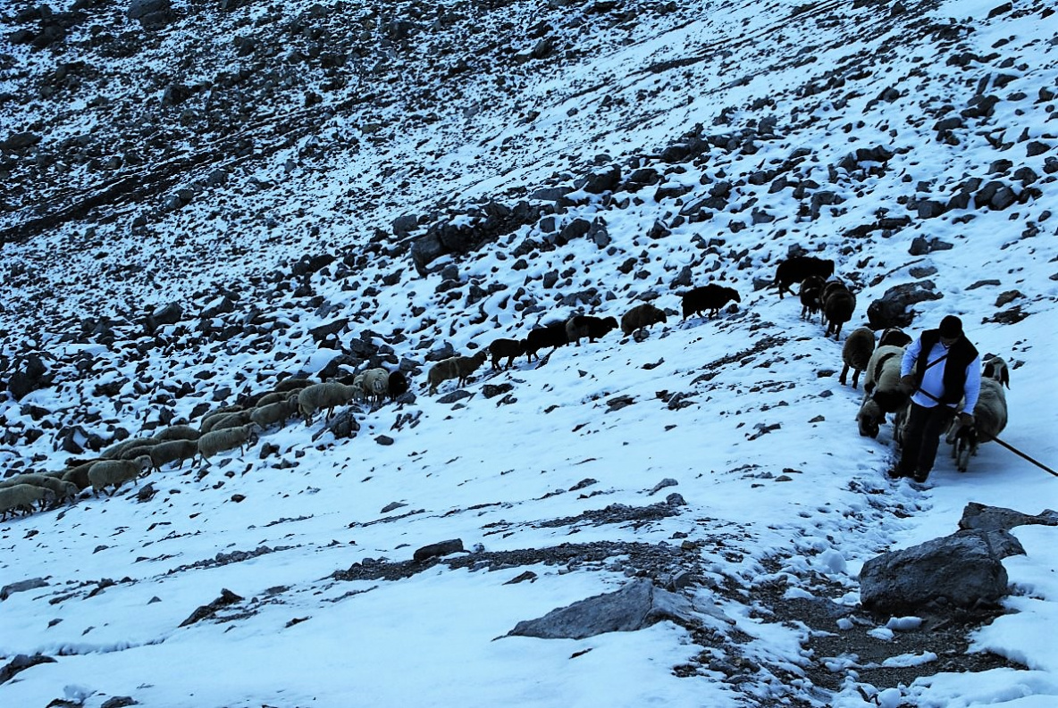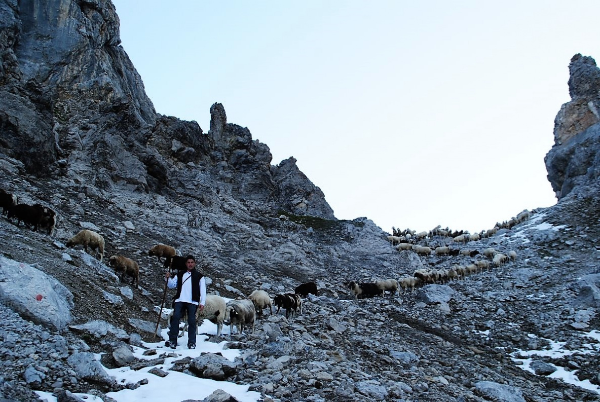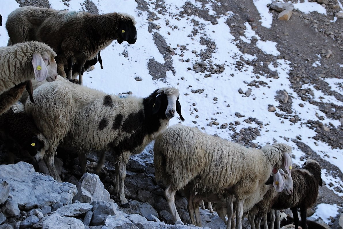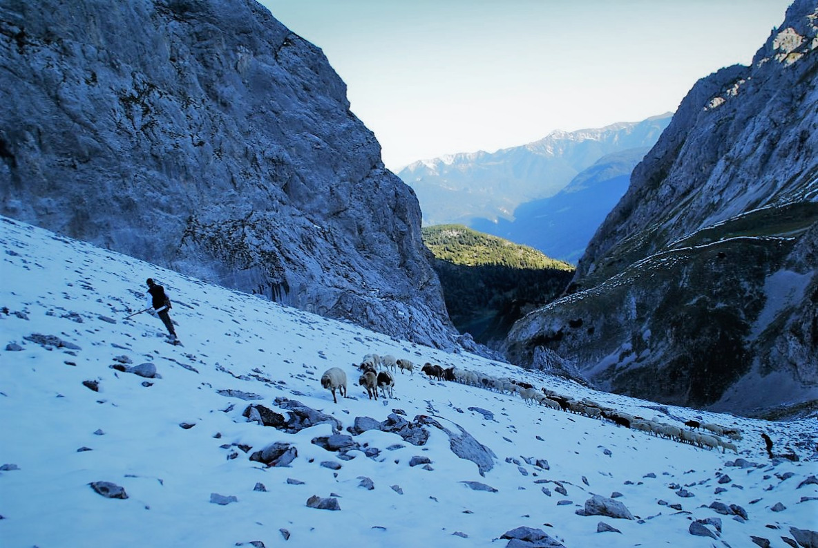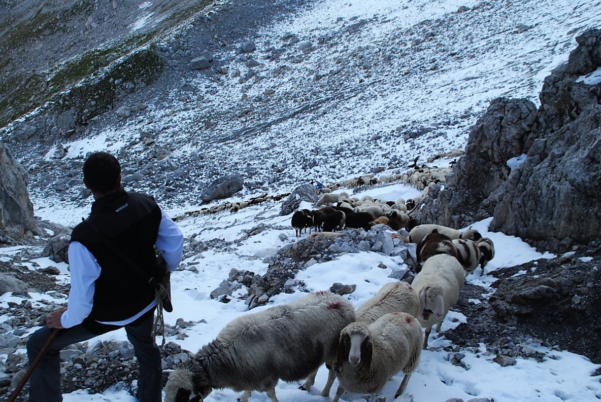 Der Tross setzt sich ruhig und konzentriert in Bewegung. Der Aufstieg zur 1917 Meter hoch gelegenen Coburger Hütte, vorbei am Drachensee (ca. 2000 Meter über Seehöhe), hoch zur 2272 Meter hohen Grünsteinscharte in der Mieminger Kette, ist zwar beschwerlich, geht aber zügig voran. Die Grünsteinscharte war bis kurz vor der Schafschoad wegen Steinschlags geschlossen. Ein neuer Pfad wurde angelegt, der zwar sehr gut ist, aber höchste Konzentration erfordert. Für Mensch und Tier. Auf dem Weg zum Drachensee überquert die Herde ein großes Schneefeld. Die Temperaturen liegen konstant im Minus-Bereich. Jeder Schritt ist gefährlich. Das Tiroler Bergschaf ist absolut alptüchtig, wie die Experten sagen. Das heißt, das Klauentier ist steig- und trittsicher. Vergleichbar, beispielsweise, mit der Gams.