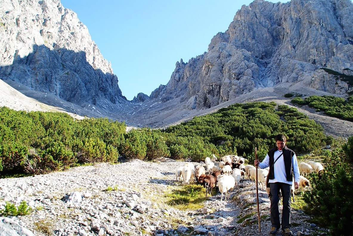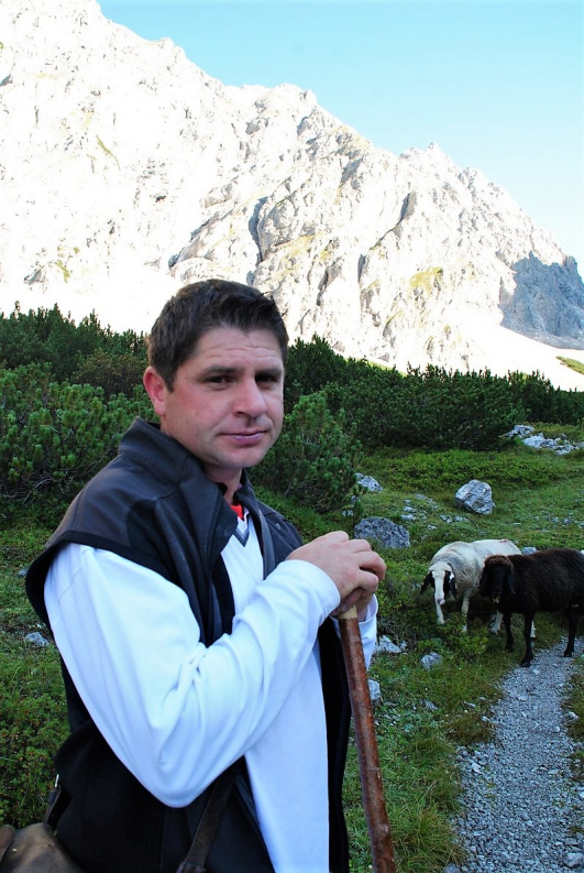 Gegen 7-Uhr-15 Uhr öffnet Dietmar Maurer das Gatter am Seebensee. Er dreht sich, Richtung Coburger Hütte und auf Los geht’s los. Dietmar Maurer muss sich nicht umschauen. Die große Schaf-Herde folgt ihm bereitwillig. Nach drei Monaten in absoluter Freiheit, beenden die Tiere ihre Sommerferien auf der Seebenalm. Gerhard Wiggins hat sie in der Woche zuvor gesucht und zur Sammel-Koppel gebracht. Zum Schluss macht er sich auf die Suche nach den erfahrenen Tieren, die in kleinen Gruppen ihre Futterplätze überall suchen. Auch auf der benachbarten Hochfeldern-Alm. Das ist Jahr für Jahr das gleiche Kraft zehrende Spiel. Erst wenn alle Bergschafe in der Sammel-Koppel am Seebensee sind, entspannt sich der Alm-Hirt. Heuer war ein guter Almsommer: keine besonderen Vorkommnisse, Gerhard Wiggins hat seine Aufgabe sehr gut gemacht. Er ist ein genetisch veranlagter Alm-Hirt.