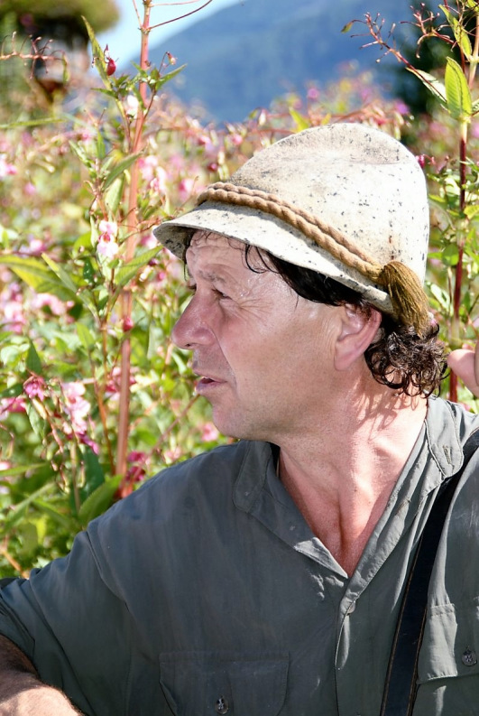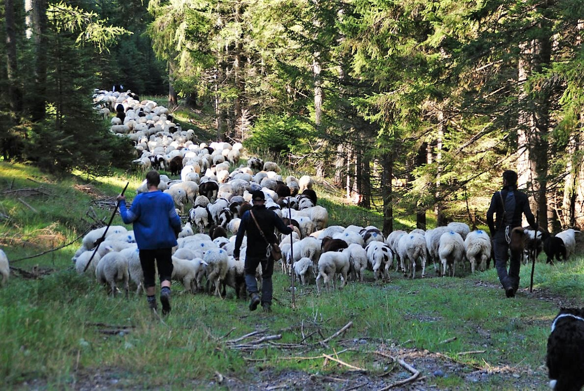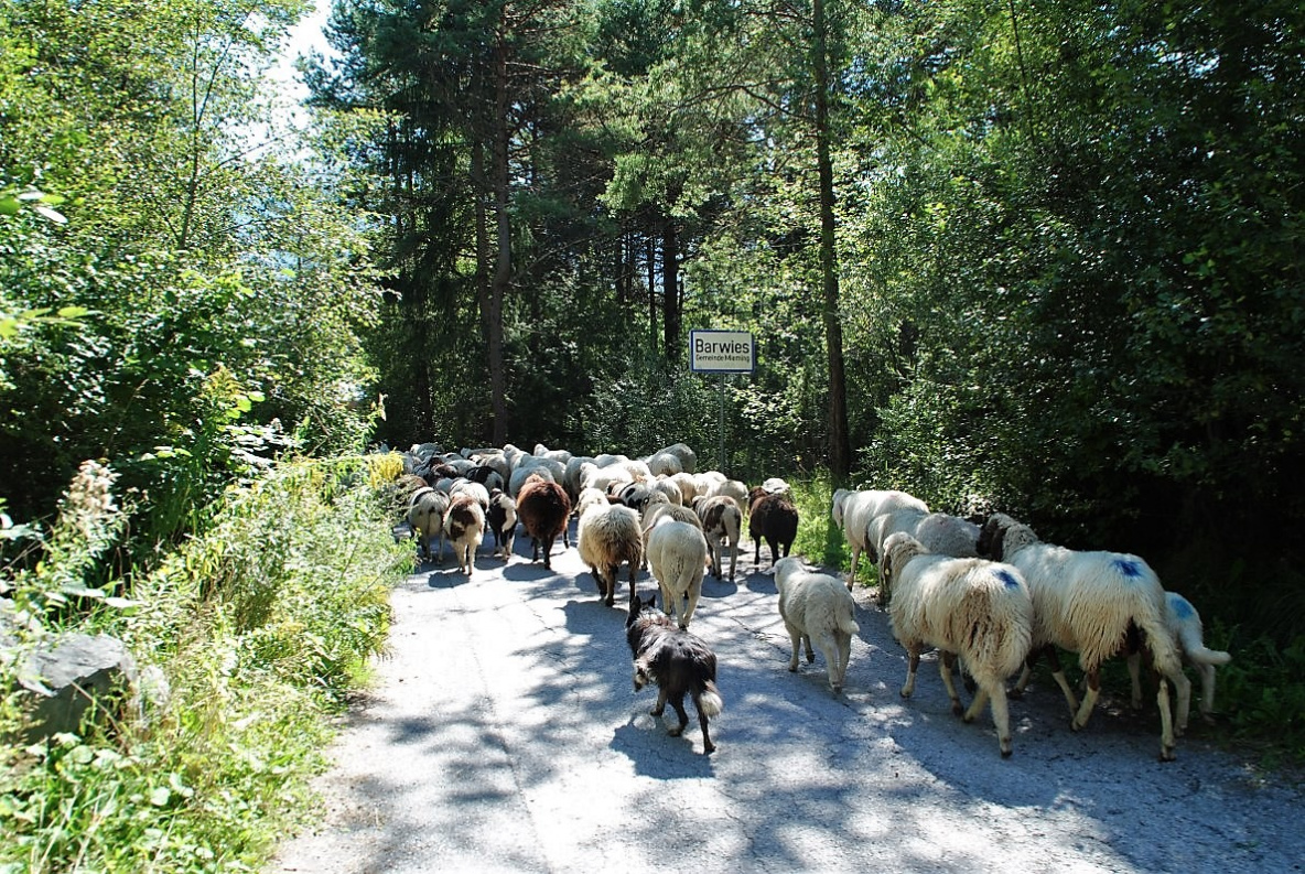 „Wer führt“, so Michi Maurer, „sollte einen guten Schritt haben, nicht zu schnell – aber auch nicht zu langsam“. Die beiden Frontleute können das mehr als perfekt. Keine leichte Aufgabe, denn ihnen folgen um die 530 Tiroler Bergschafe, Schaf für Schaf im „Gänsemarsch“. Hinten gehen Hanna Maurer und Hermann Neuner. An den Flanken die drei Border-Collies Senta, Jessie und Lord.