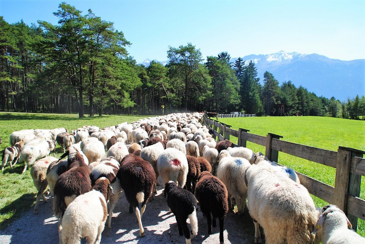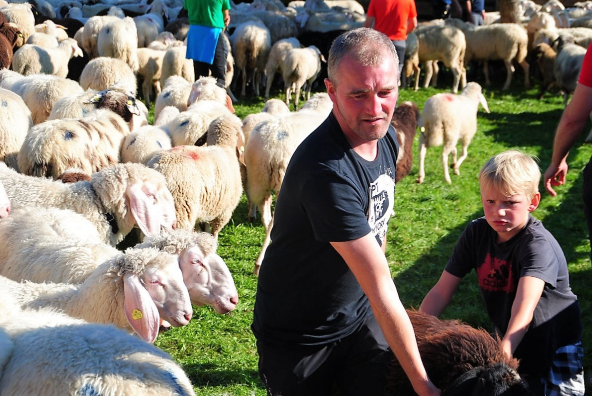 „Vorn gehen die Kräftigen, hinten die Lampelen, die noch mit der Flasche großgezogen wurden“, sagt die Mieminger Ortsbäuerin Michaela Maurer. Der Schafabtrieb von der Seebenalm nach Mieming wurde vom Seeben-Alm-Hirt Gerhard Wiggins und dem Schafbauern Dietmar Maurer angeführt.