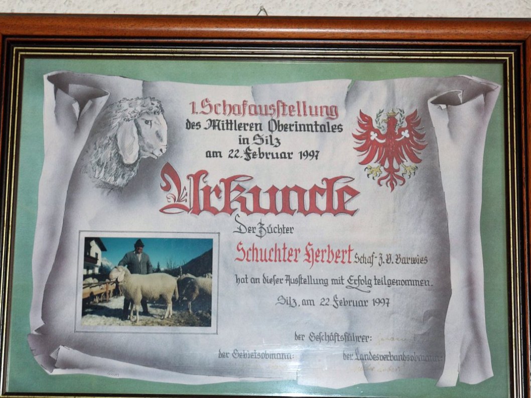 Herbert Schuchter gehört zweifellos zu den am meisten ausgezeichneten Tiroler Bergschafzüchtern der Region. Im April 2012 ernannte der Schafzuchtverein Barwies Herbert Schuchter „für 50-jährige Tätigkeit als Obmann zum Ehrenobmann“ und ein paar Wochen später erhielt er vom Tiroler Schafzuchtverband das „Ehrenzeichen in Diamant“ für „besondere Verdienste auf dem Gebiet der Tiroler Schafzucht“.