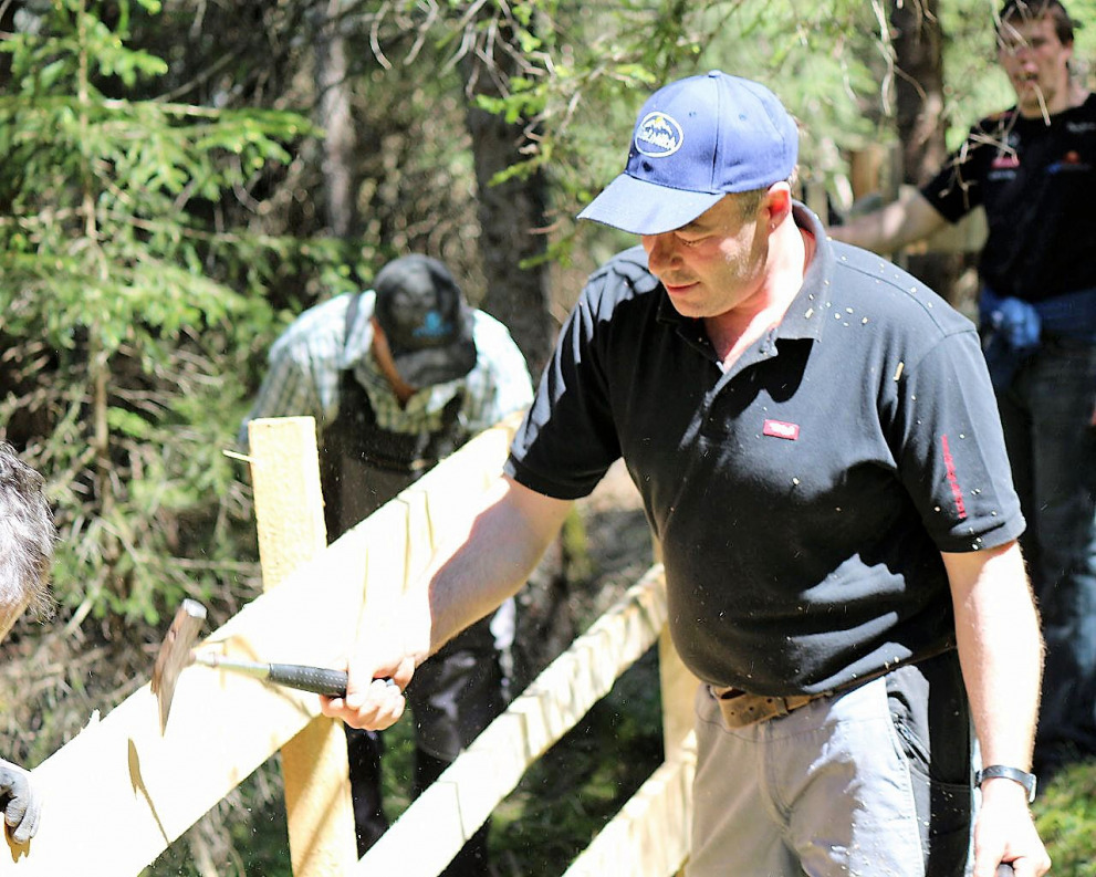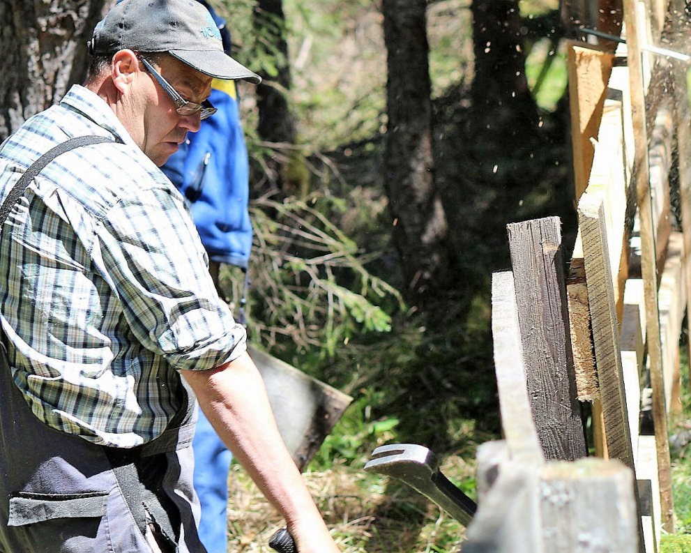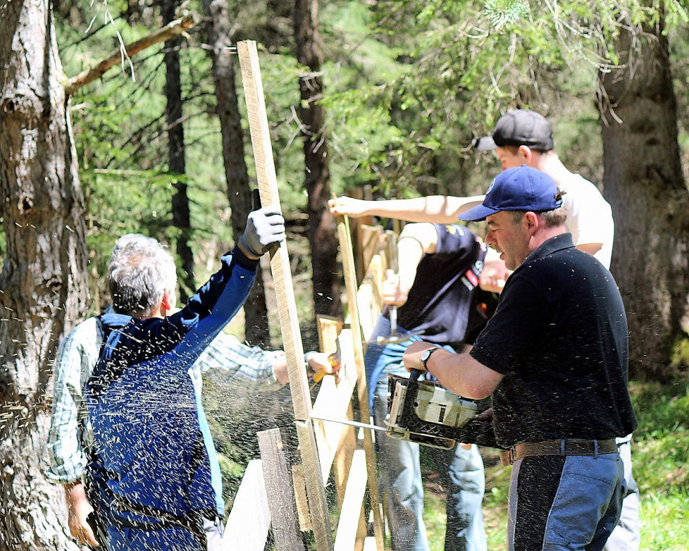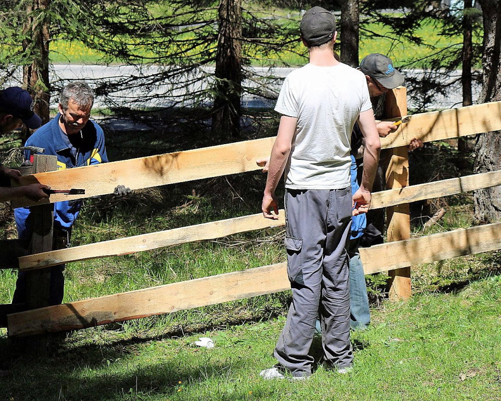 Das Zäuner-Team um Benedikt van Staa, steckte im tiefen Wald und hatte schon ein paar hundert Meter Zaun, zwischen Weißensee und dem im vergangenen Jahr eröffneten Hotel McTirol im Straßendorf Biberwier instandgesetzt.