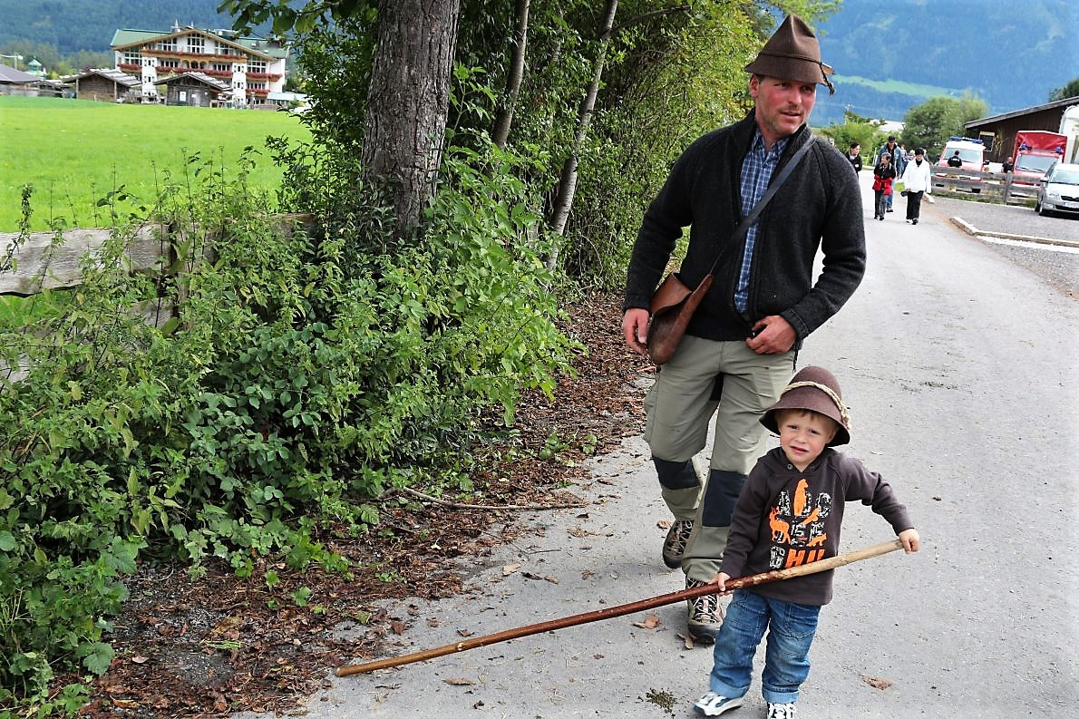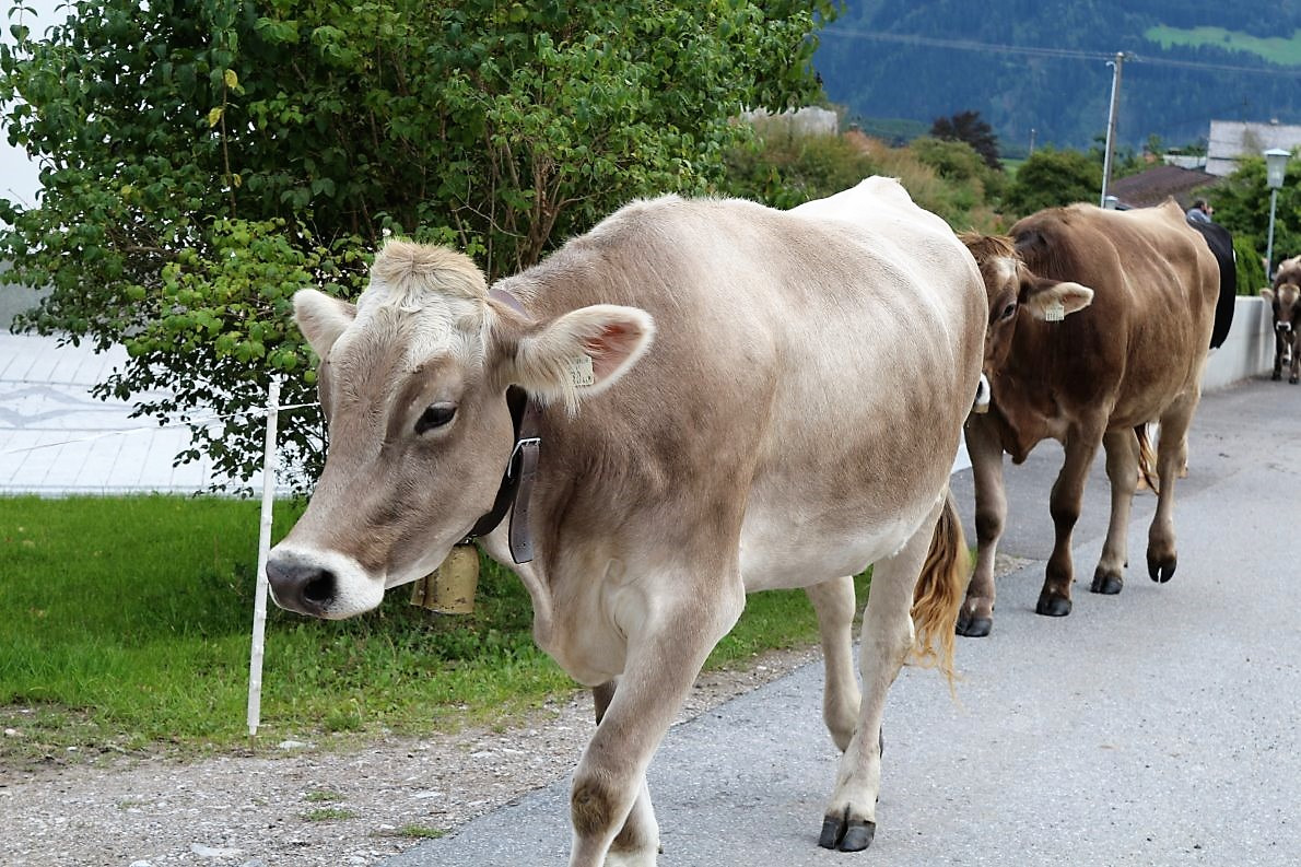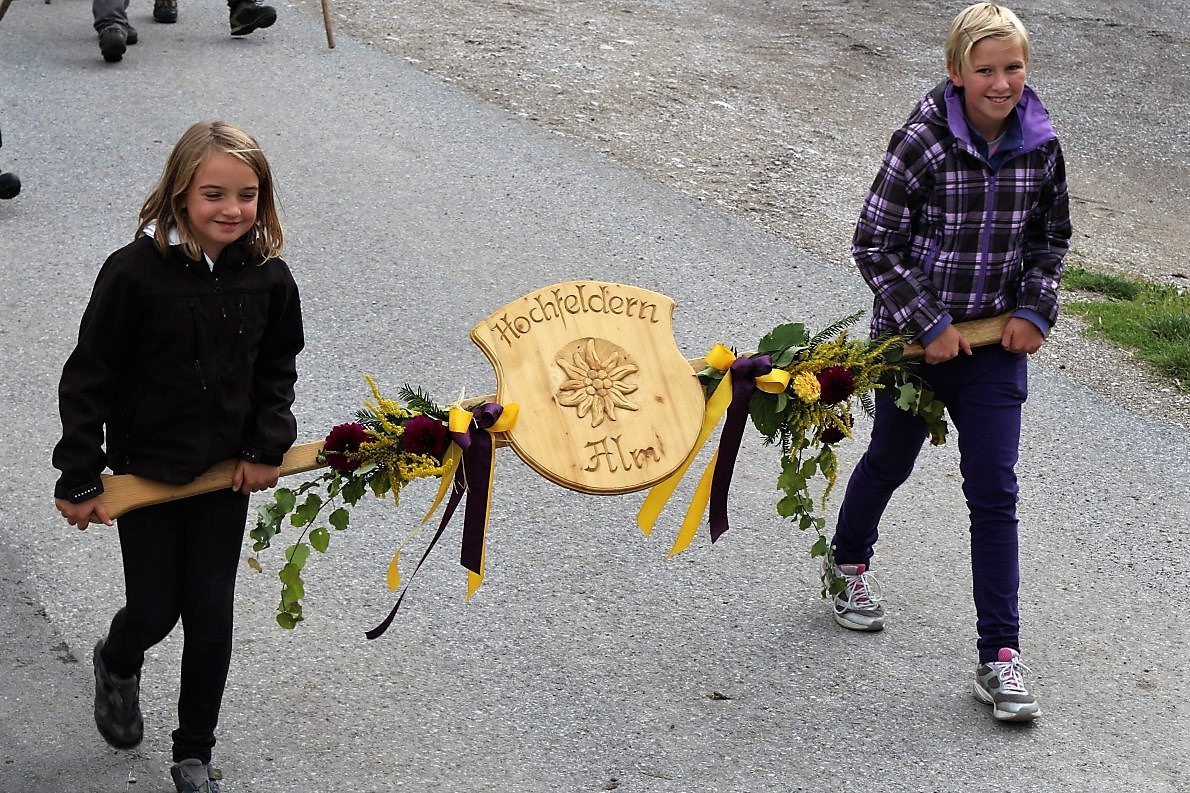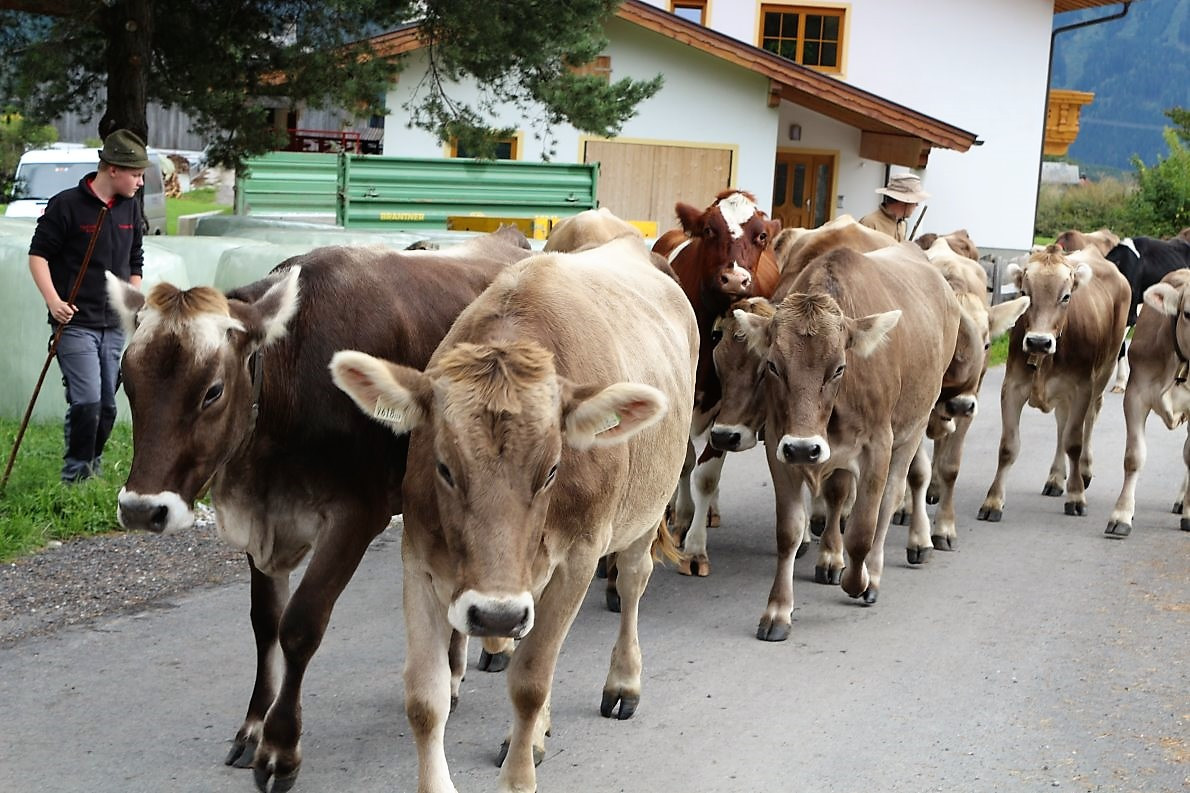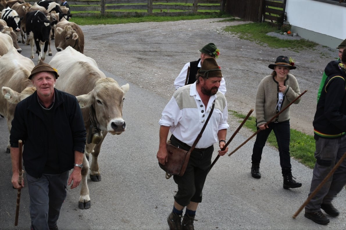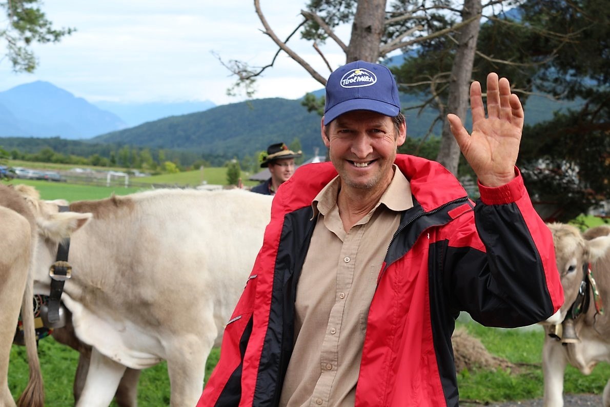 Frage an den Almmeister: „Heuer hättet Ihr es Euch leichter machen können und das Vieh mit dem Wagen nach Mieming transportieren können?“ Klaus Scharmer antwortet: „Wir halten an der Tradition fest. Seit mehr als 100 Jahren gibt es den Almabtrieb von der Feldereralp, über Buchen, Telfs, Gerhardshof, Affenhausen nach Obermieming. So auch heuer“.