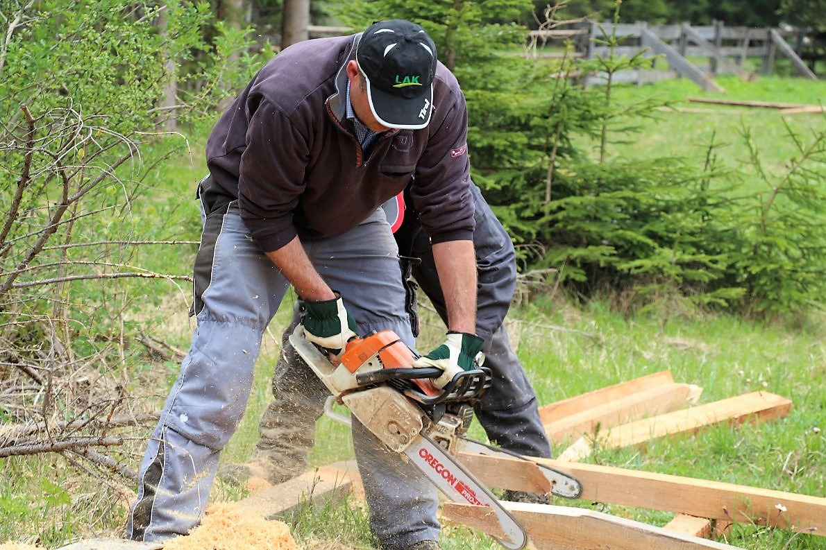 Wer eine Motorsäge trägt, der sägt. Die Hammerträger schlagen mit ihrem meist 600 Kilogramm (und schwerer wiegenden Geräten) die zuvor angespitzten Pfosten ein. Wer Hammer und Nägel am Gürtel trägt ist für das Nageln zuständig.