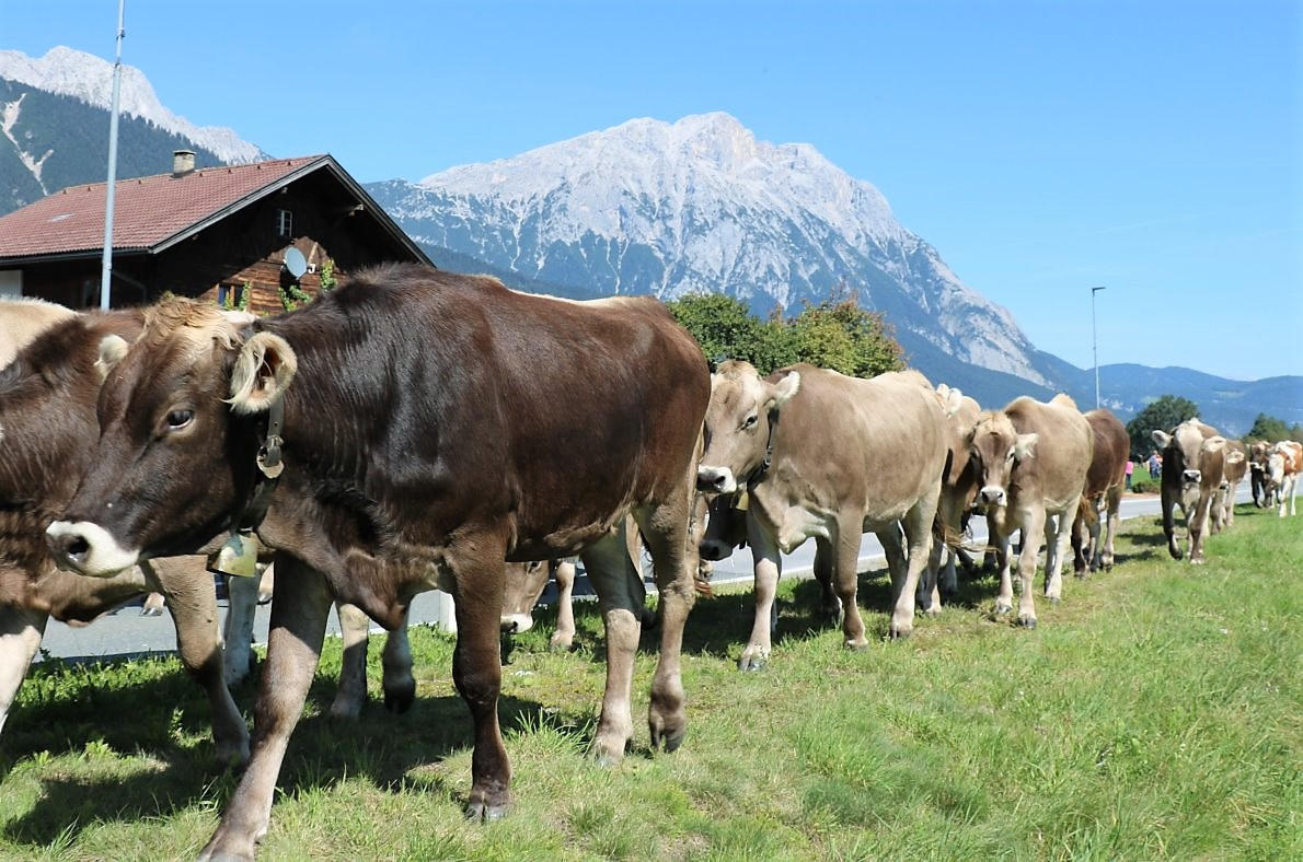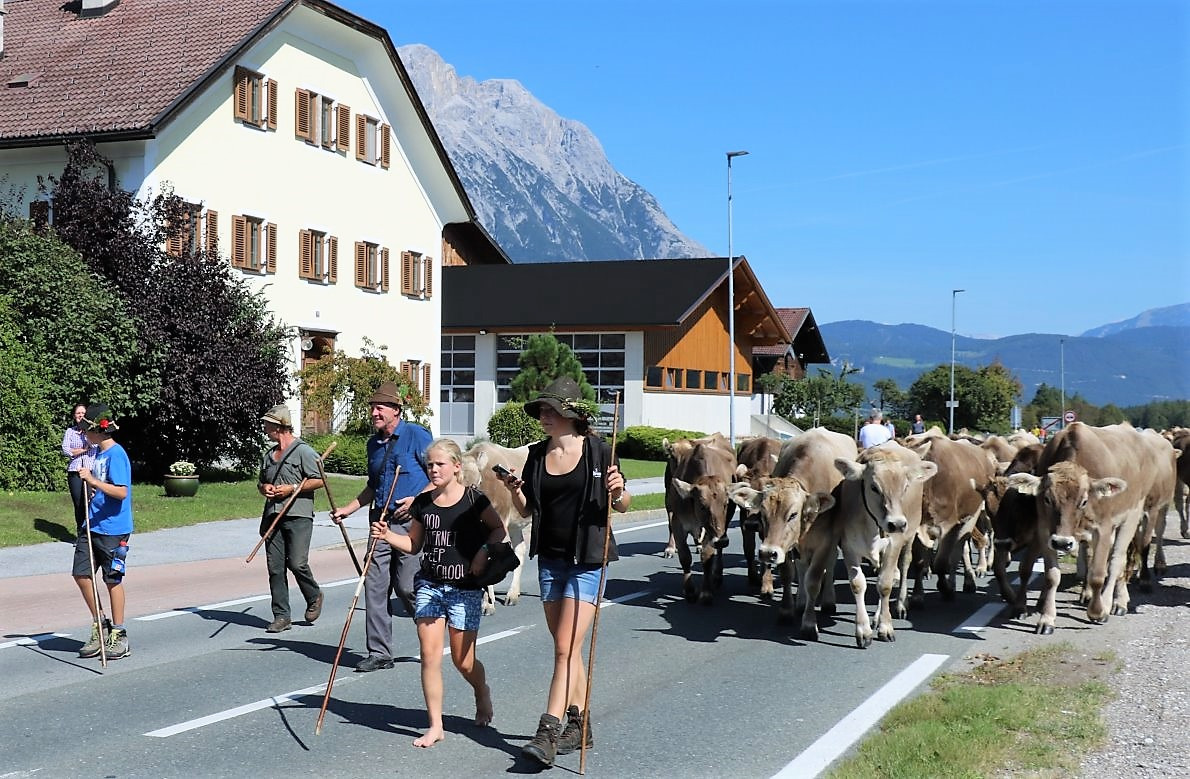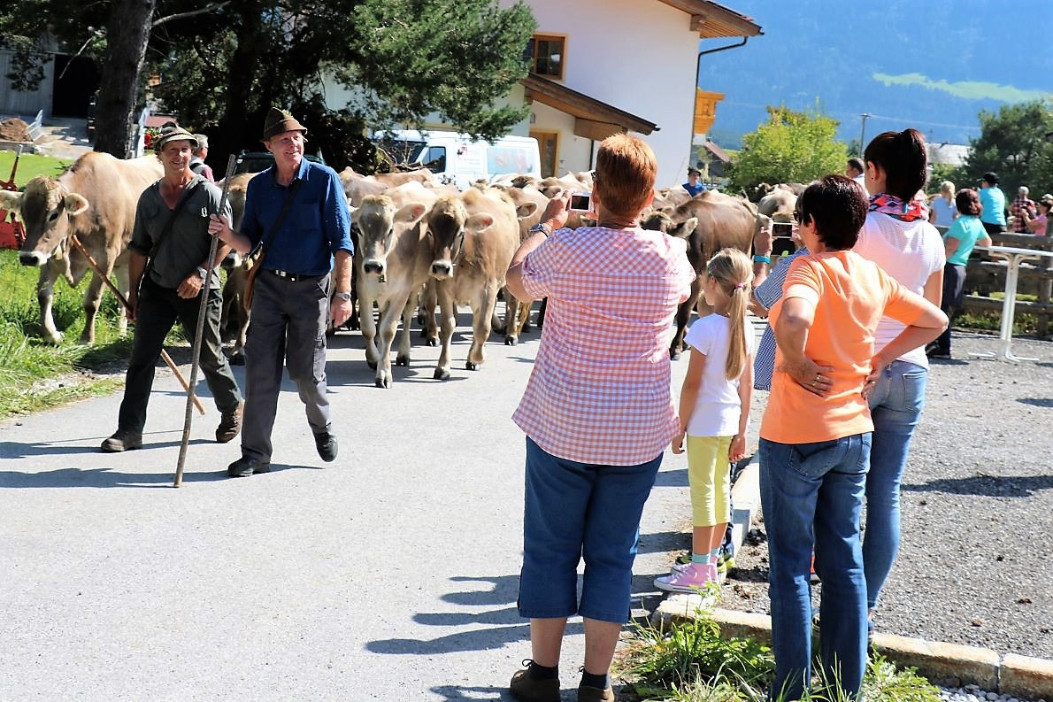 Die Hirten und ihr Vieh, die Bauern der Feldereralpe und alle, die beim Almabtrieb von der Hochfeldern Alm aktiv dabei waren, bekamen bei ihrer Ankunft in Obermieming viel Applaus. Für die körperliche Leistung von Mensch und Vieh beim Kraft zehrenden Almabtrieb, aber auch für die Gesamtleistung aller im heurigen Almsommer.
