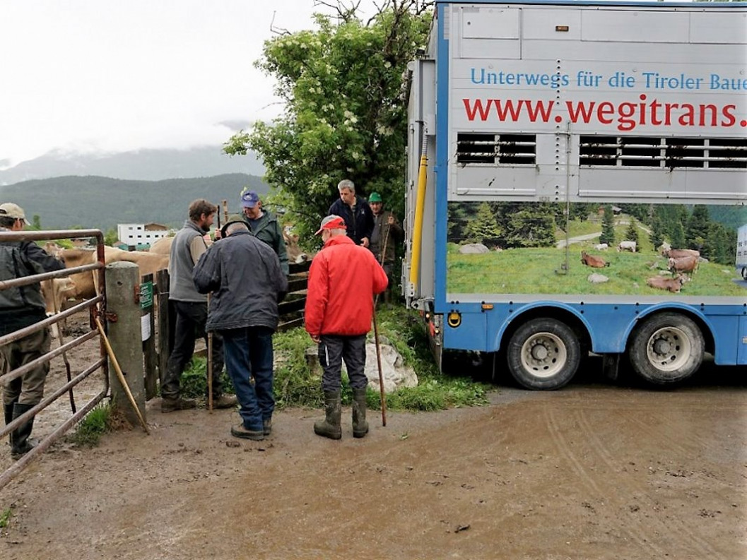Alle waren pünktlich, am Freitag, dem 17. Juni 2016. Allen voran Almmeister Klaus Scharmer. „Unterwegs für die Tiroler Bauern“ ist traditionell der Almviehtransporter Martin Wegscheider und sein Team aus Tulfes. Auf jedem Transporter haben in jeweils zwei Hängern ca. 100 Tiere Platz.