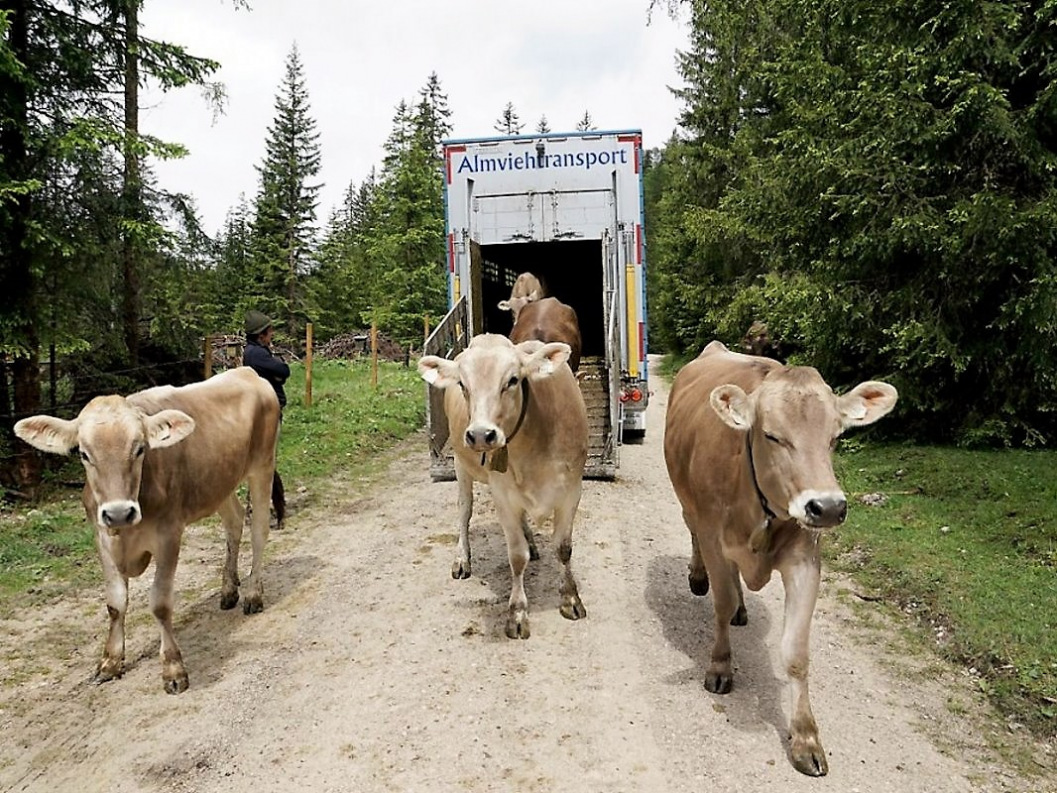 „Wir treffen uns am Freitag-Morgen um 4 Uhr“, sagt Martin Reich, mit Fabio Riml im Hirten-Team der Feldernalm. Am Vorabend wurde das Vieh am Kälberhag in Obermieming zum Sammelplatz getrieben. „Zählen müssen wir sie noch, bevor der Almviehtransporter kommt.“