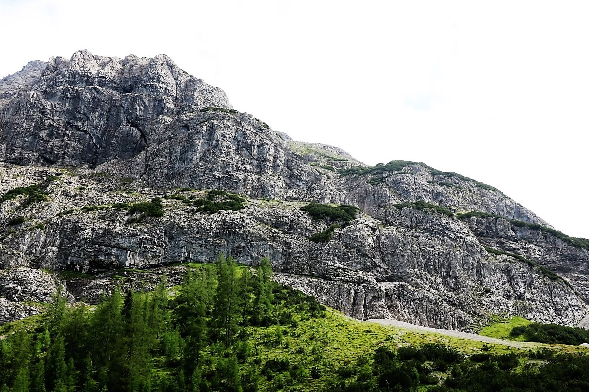Die Seeben Alm im Gaistal wird von einem neuen Wall gegen Steinschlag geschützt. Wanderer werden den Schutzwall kaum bemerken. Zu sehen ist er nur aus der Höhe, mit Blick auf die Almhütte und Ehrwald.