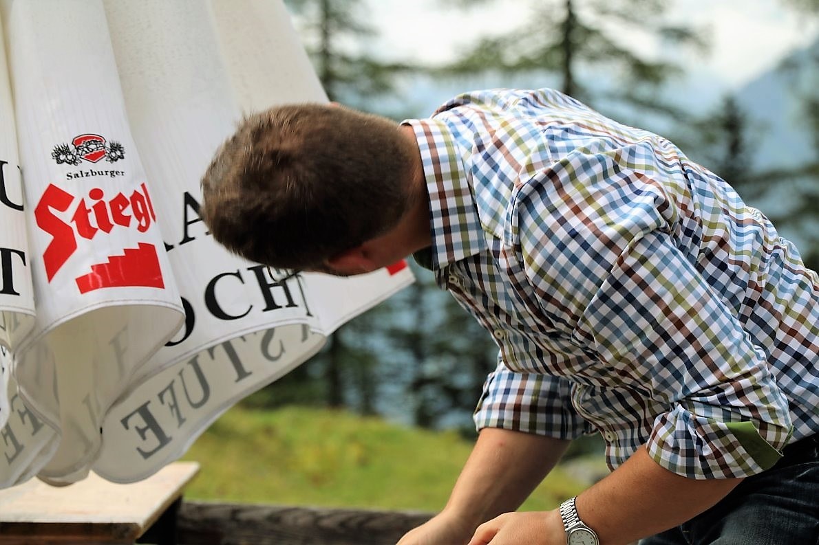 Hüttenwirtin Claudia Wiggins freut sich mit ihrem Team über zahlreiche Gäste. „Es läuft gut“, sagt sie, „bei jedem Wetter.“ An unserem Besuchstag war die Wetterlage unbeständig. Mehr Wolken als Sonne und am Nachmittag mussten die Sonnenschirme gesichert werden.