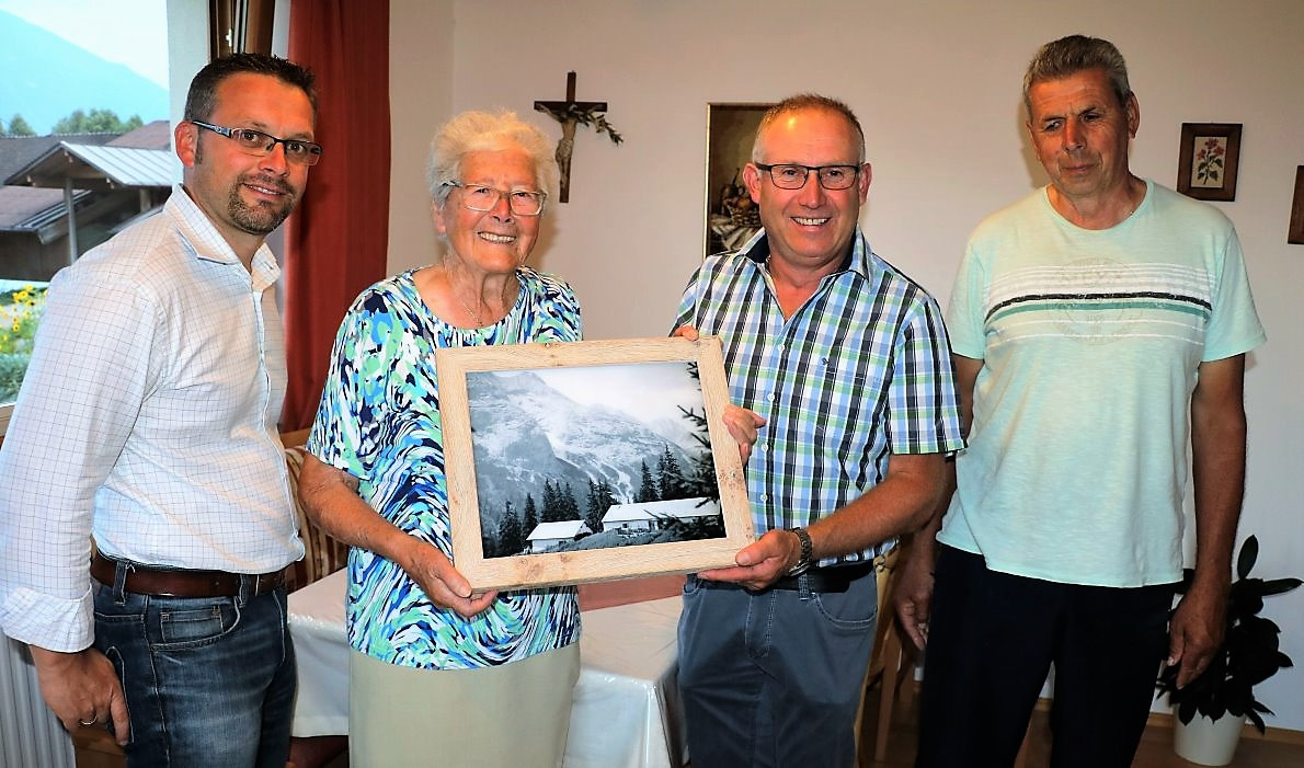Am Samstag-Abend, dem 27. September, vor dem großen Fest zur Einweihung der neuen Hochfeldern Alm, überreichte die Scharmer Anna das inzwischen gerahmte und vergrößerte Foto einer kleinen Delegation um Almobmann Klaus Scharmer und Vize-Bürgermeister Martin Kapeller. Mit dabei Annas Sohn Konrad. Konrad Scharmer war von März 1996 bis März 2001 Almobmann auf der Hochfeldern Alm.
