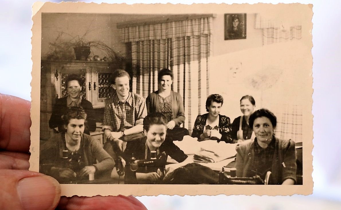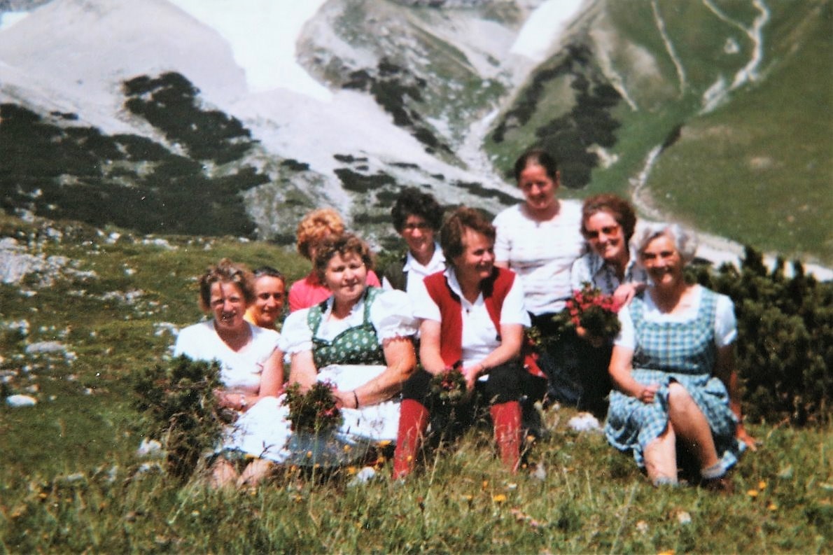 Anna zeigt auf das Bild und zählt auf, wer darauf alles zu sehen ist (von links): „Das sind die Kapeller Hanni, die Larcher Anna, Paula Kranebitter, Klara Spielmann, Maria Nairz (die war damals Ortsbäuerin in Mieming), Julia Kuprian (damals Gebietsbäuerin), Gerda Plattner, Liesl Wackerle und Berta Dietrich.“