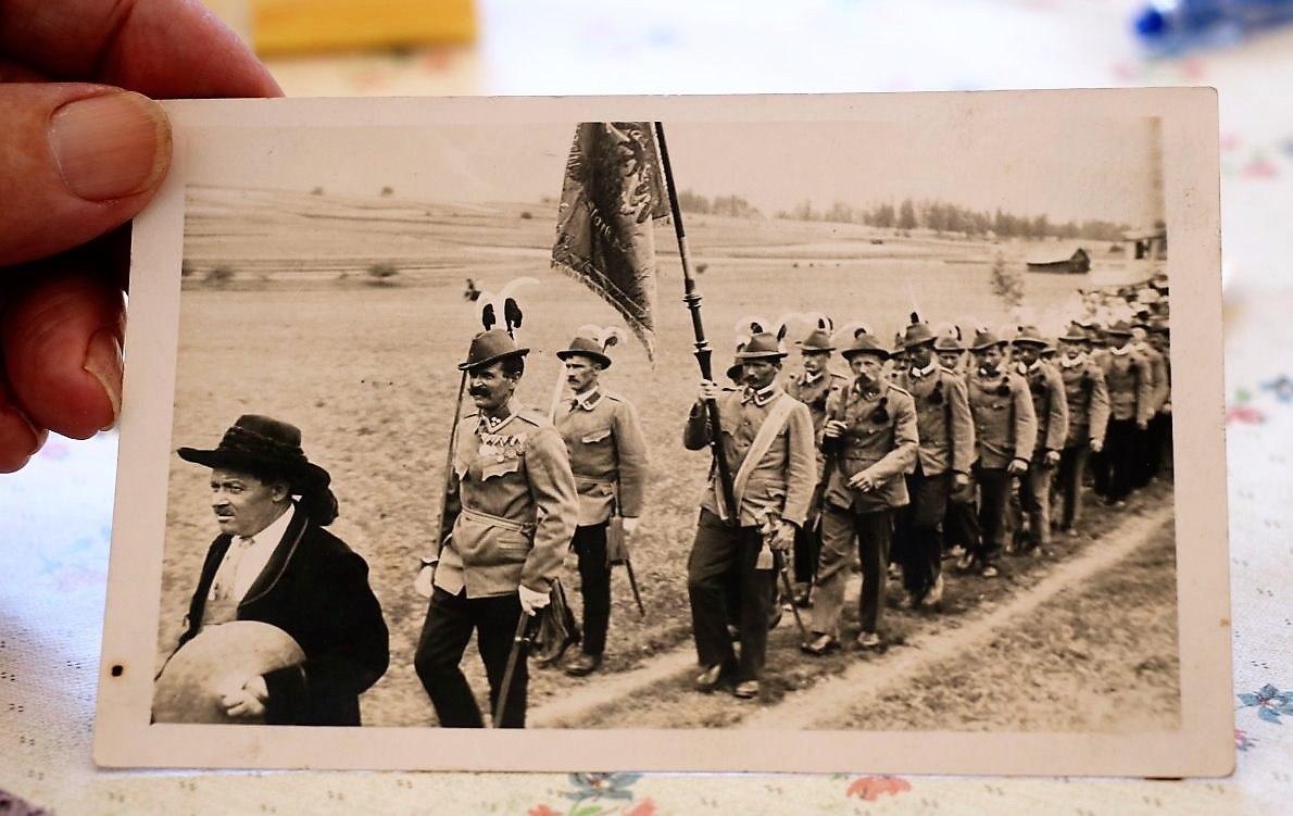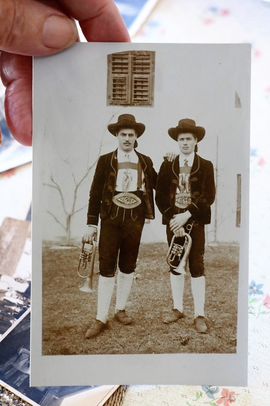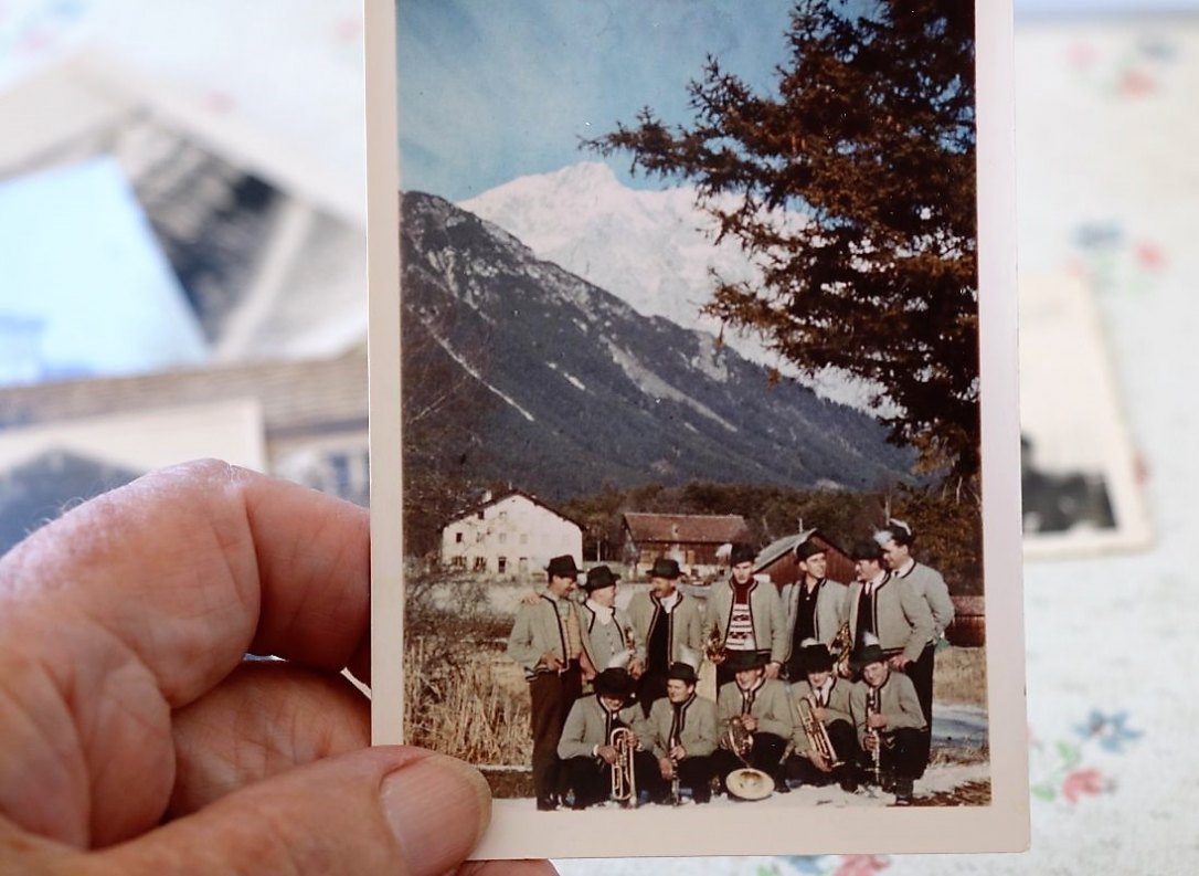 Bei unserem Besuch im Haus der Familie Scharmer in Obermieming, zeigt Anna noch ein paar Bilder aus alten Zeiten. Eines zeigt Männer der Schützenkompanie bei einer Isidori-Prozession in Untermieming. „Die Bilder wurden noch vor dem 1. Weltkrieg gemacht. Alle trugen noch die alte Tracht. Auch die Musikanten der Musikkapelle.“