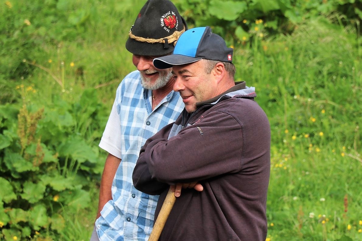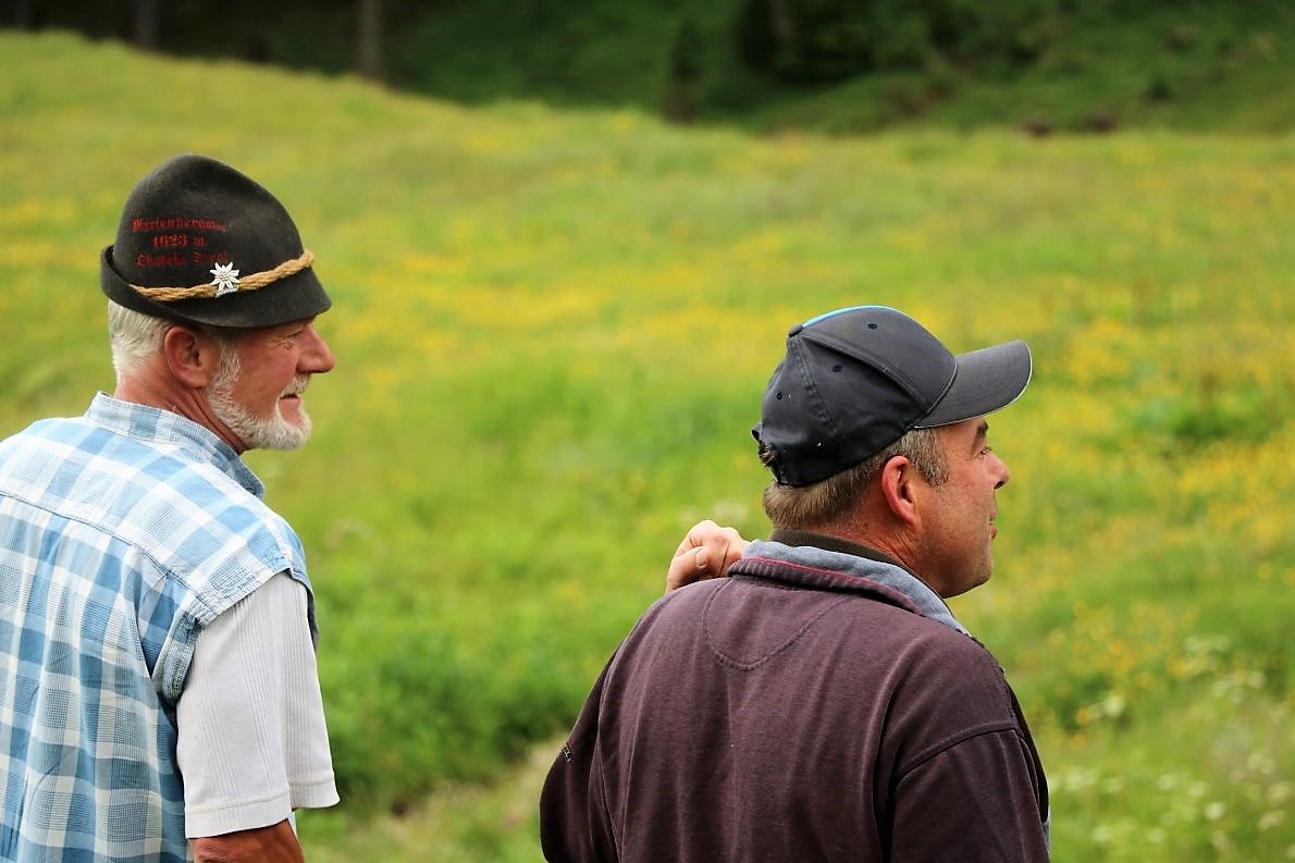 Wir treffen Patrick Spiecker, den neuen Hirten der Marienbergalpe. An seiner Seite Alt-Hirt Herbert Schuchter, der ihm schon seit Anfang Mai beim Einarbeiten hilft. Patrick kommt aus Serfaus und ist hoch motiviert. „Wir freuen uns alle mit ihm und denken, dass wir eine gute Wahl getroffen haben“, sagt Almchef Benedikt van Staa.