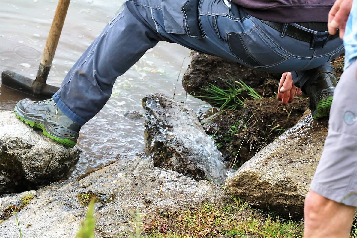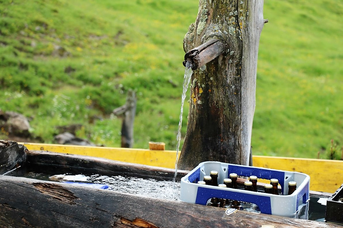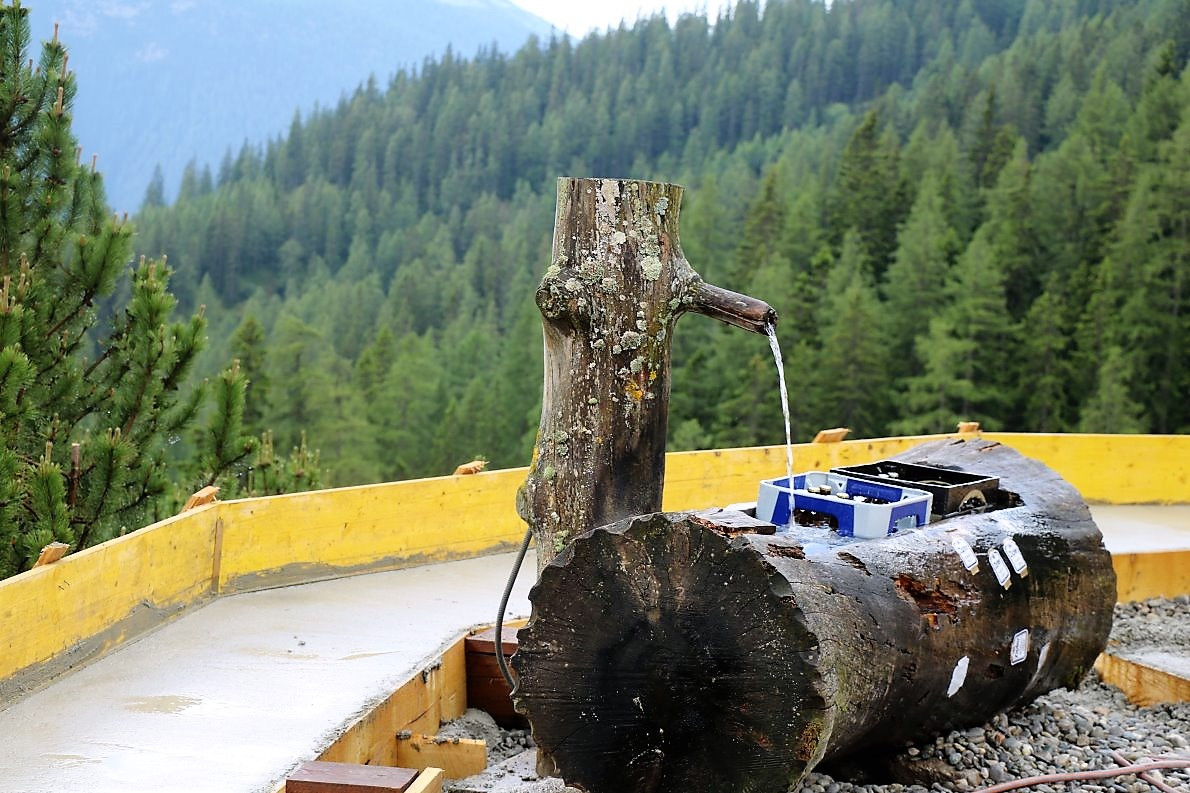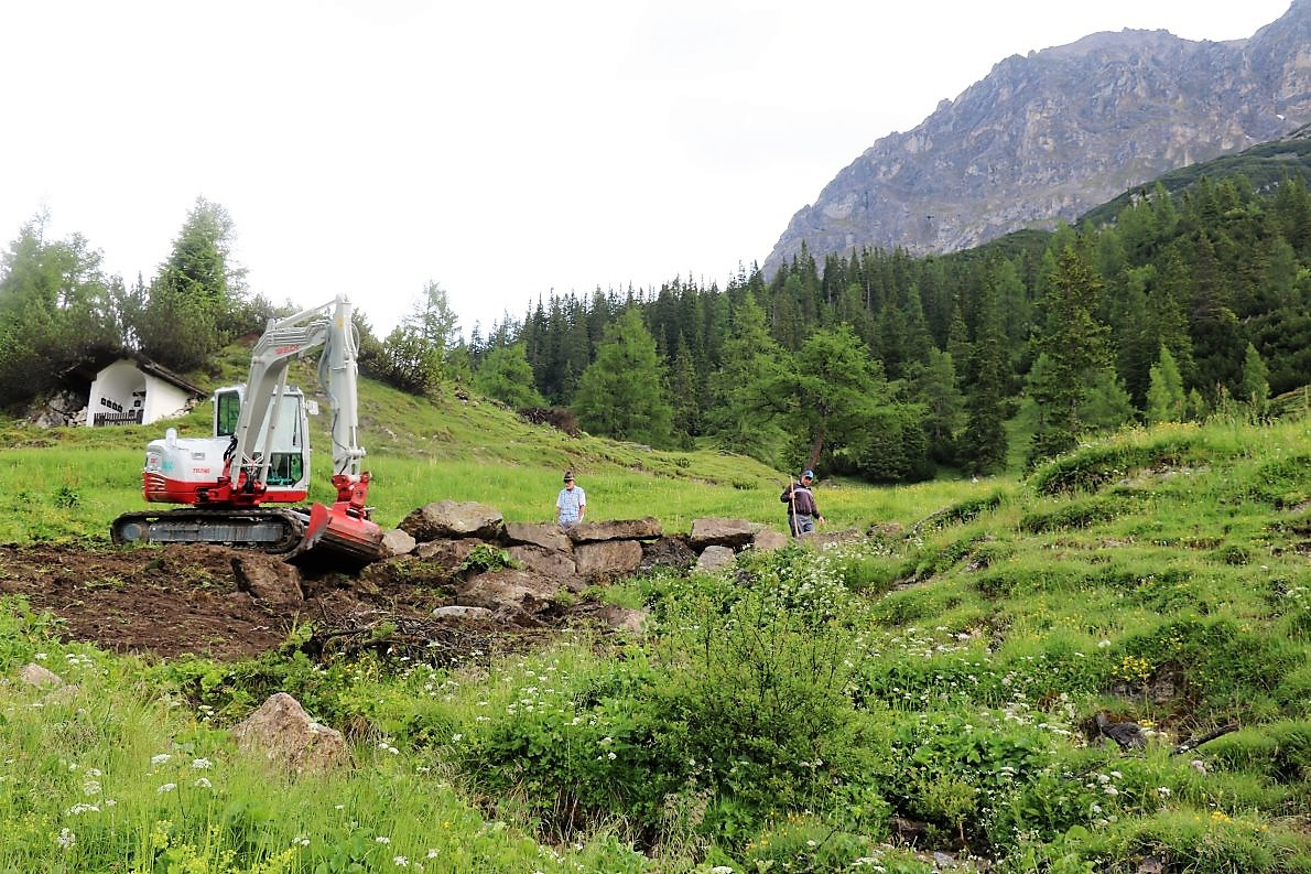 „Die Außenwände der Hütte sind neu isoliert und verputzt worden, die Terrasse wird größer. Bekommt einen Holzfußboden mit Zaun und wird von einer Natursteinmauer gestützt“, hören wir vom Barwieser Obmann der Agrargemeinschaft Marienbergalpe. „Mit den verbliebenen Steinen bauen wir heute noch eine neue Viehtränke, mit ständigem Wasserzulauf.“