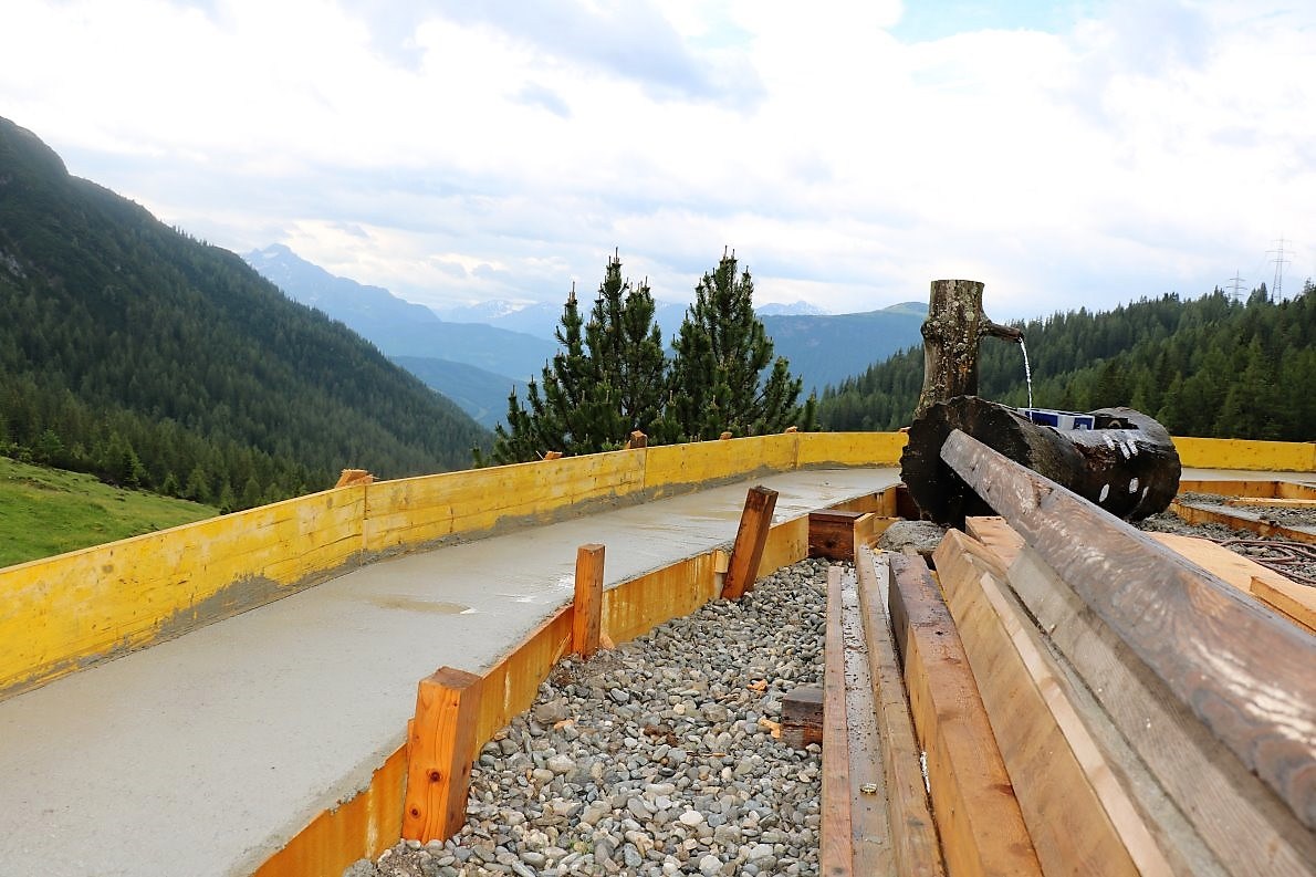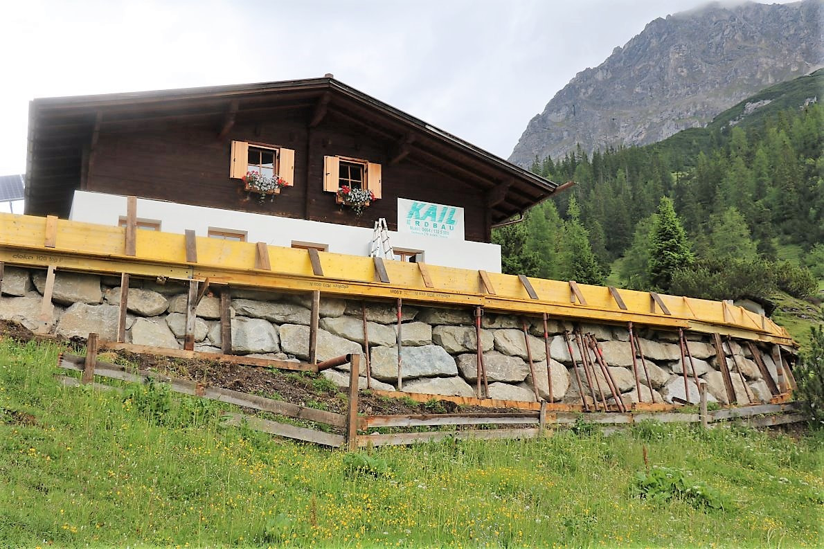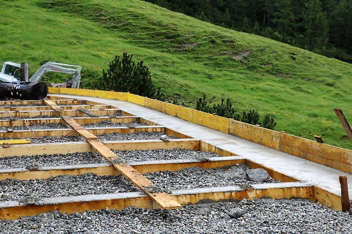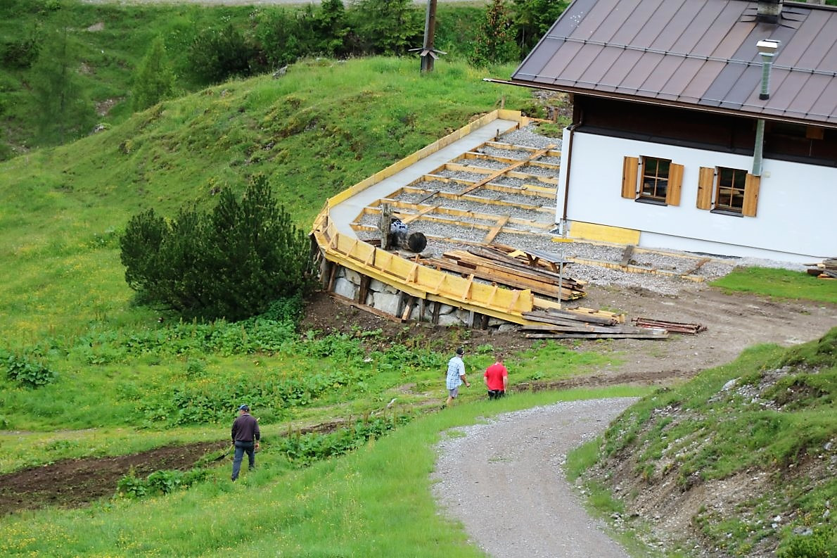 Die Terrasse wird mit einem Lärchenholz-Fußboden bedeckt. Aus dem gleichen Holz wird auch der Zaun gebaut. Alles ruht auf fest-gegossenen Fundamenten mit stabiler Hinterfüllung. „Wir werden mit der neuen Terrasse um ca. 40 Quadratmeter mehr Platz für die Gäste der Marienberg Alm haben“, sagt der Almobmann. Für die Erd- und Baggerarbeiten wurde Thomas Kail aus Gschwent engagiert, Christian Maurer aus Mieming-See war für die Fassaden-Isolierung und die Trockenlegung des Hüttenbetriebes verantwortlich. Neu in diesem Zusammenhang ist auch eine Drainage. Die Entwässerung des neuen Terrassenbodens war im Zuge der aktuellen Baumaßnahmen notwendig.