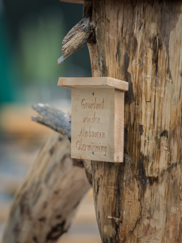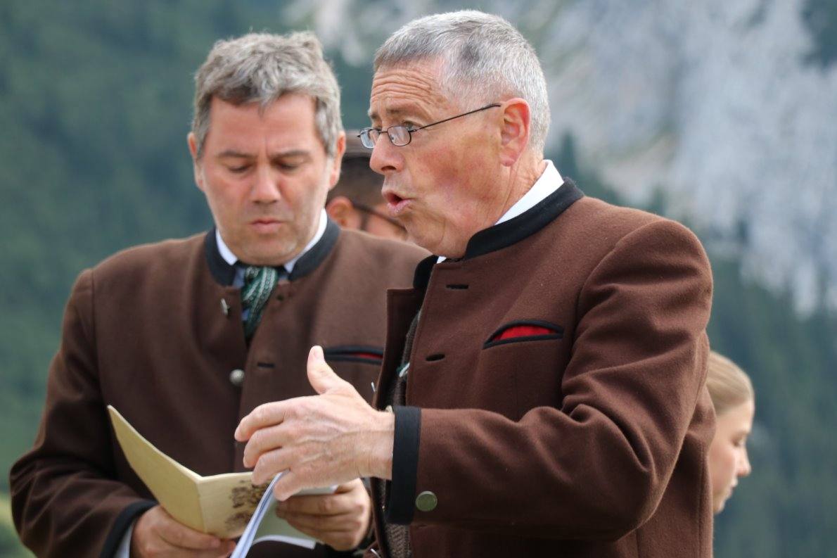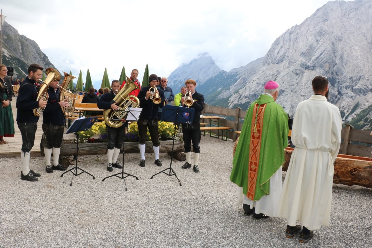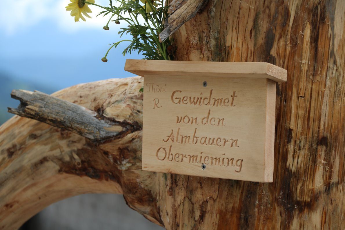 Abt Mag. Raimund Schreier (Stift Wilten) feierte die Almmesse. An seiner Seite Frater Pius, ein geistlicher Gast aus Polen. Für die musikalische Messgestaltung sorgten die Mieminger Sänger, unter der Leitung von Hans Holzeis, mit Unterstützung der Mieminger Weisenbläser. Im Anschluss an den Gottesdienst segnete der Wiltener Abt den neuen Lärchenholz-Brunnen der Hochfeldern Alm, den der Holzschnitzer und Bildhauer Reinhard Thöni aus Pfunds gestaltet hat. Auf einer Holztafel steht: „Gewidmet von den Almbauern Obermieming“. Die Idee dazu hatte Martin Spielmann.