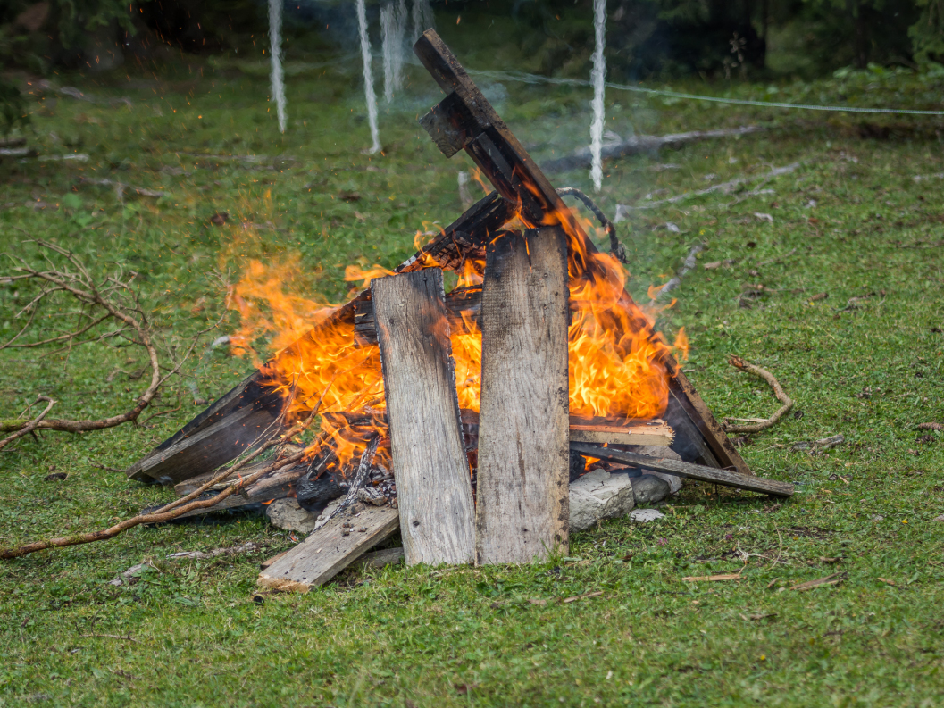 Nach der Ankunft am „Kälberhag“ in Obermieming (dem Vorberg der Hochfeldern Alm), beim Bauernhof der Familie Post, wurde der zu Ende gehende Almsommer noch bis in die Abendstunden im geheizten Zelt gefeiert.