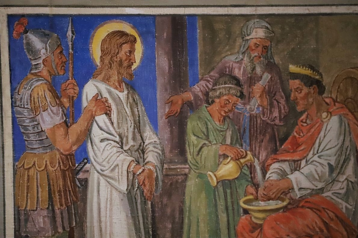Gestern, am Gründonnerstag, zeigte sich die Grabeshöhle noch verschlossen. Am Karfreitag und Karsamstag bewachen zwei römische Soldaten den in der Nische liegenden Leichnam Christi.