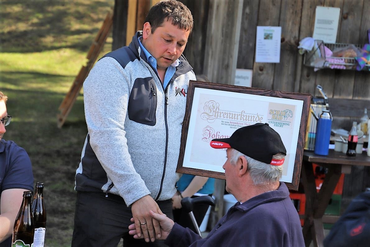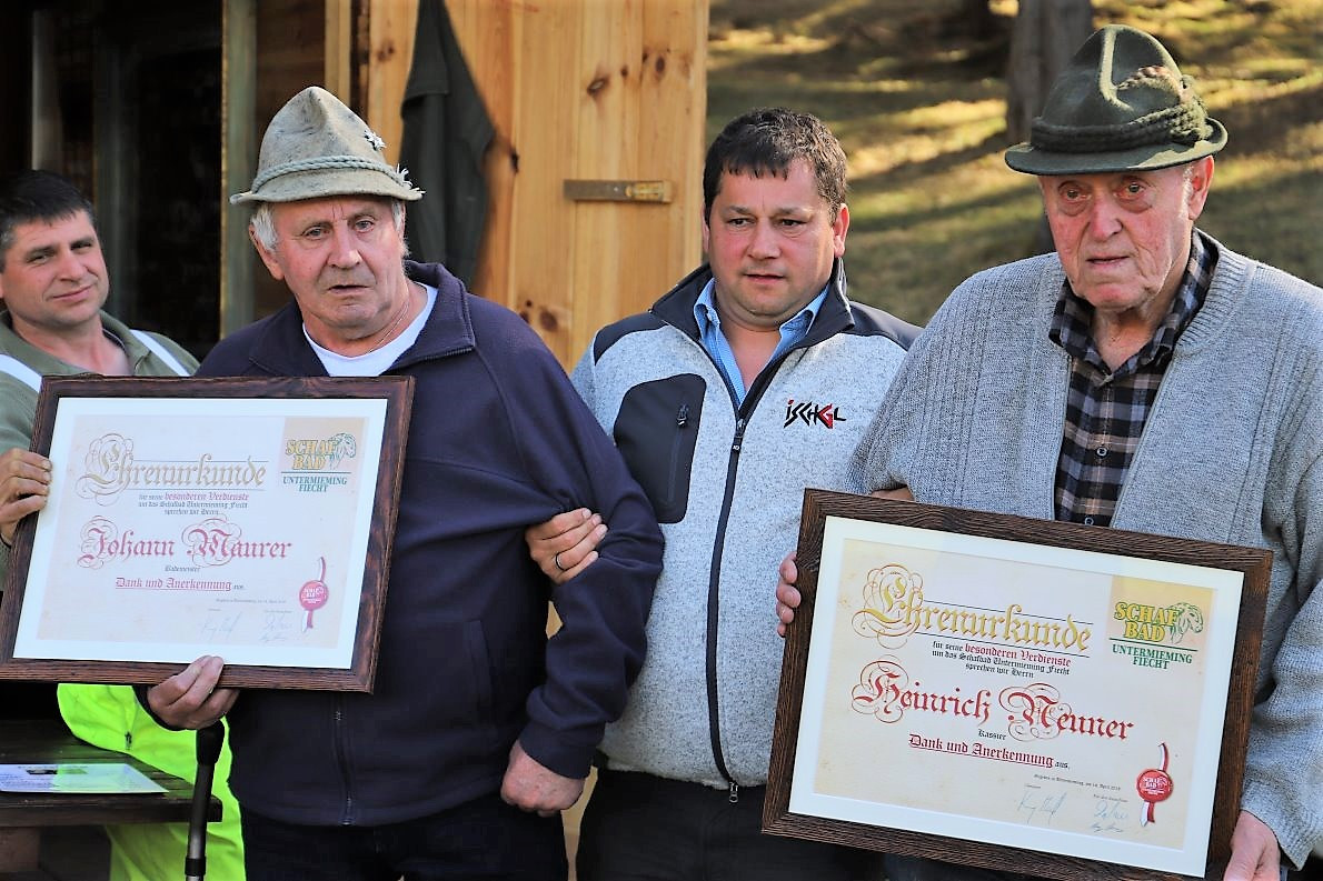 Obmann Manfred Krug führte aus, dass die beiden Geehrten zu den Gründervätern des Vereins „Schafbad Fiecht“ gehören. Johann „Hansl“ Maurer war über 18 Jahre lang Bademeister und die „Gute Seele am Schafbad“. Krankheitsbedingt musste er vor zwei Jahren das Amt an Sohn Dietmar Maurer übergeben.