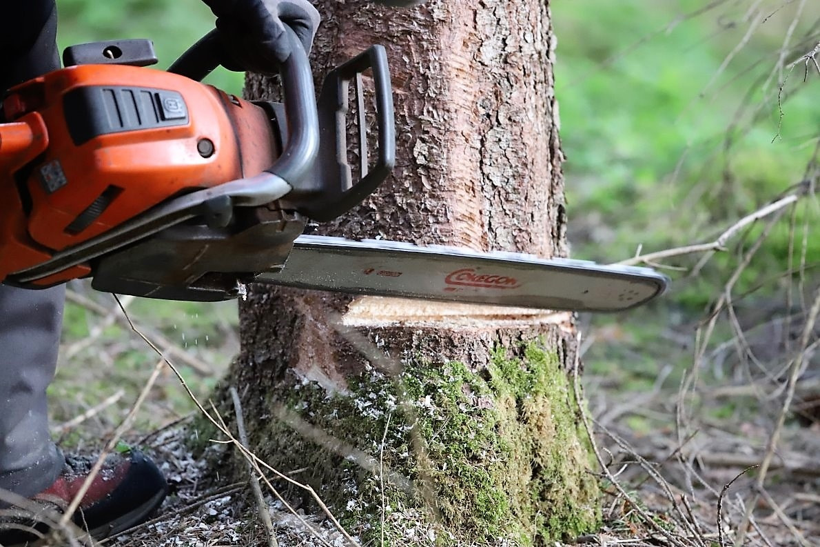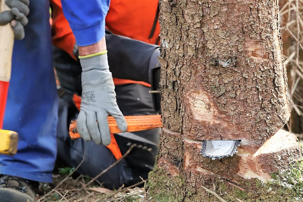 Dann kommt die Motorsäge zum Einsatz. Ein in die Fallkerbe geschlagener Keil bestimmt die endgültige Fällrichtung.