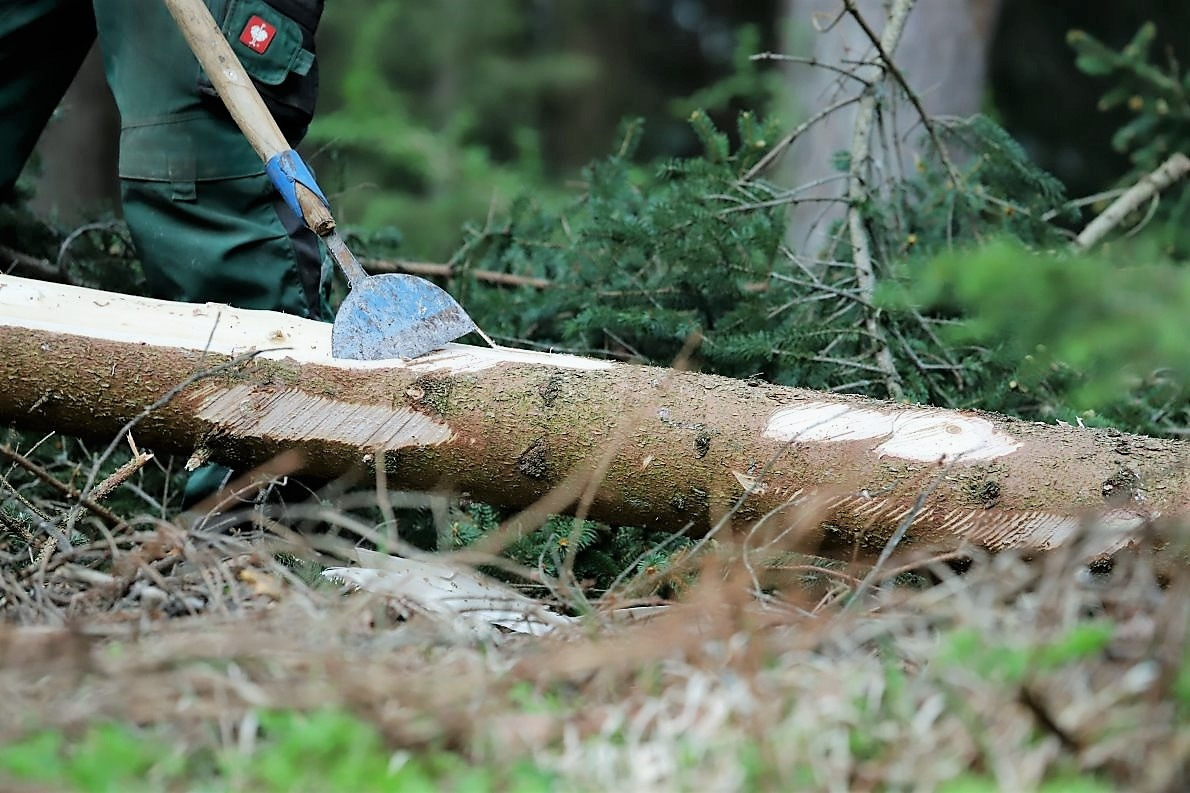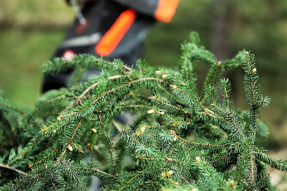 Vor dem Abtransport werden die Äste abgesägt und die Rinde geschält. Dann geschieht das Unerwünschte: Beim Anheben des Baumes bricht die Krone ab. Die am Boden liegende Baumkrone misst rund zwei Meter.