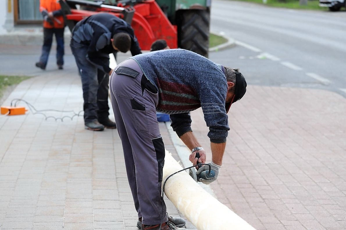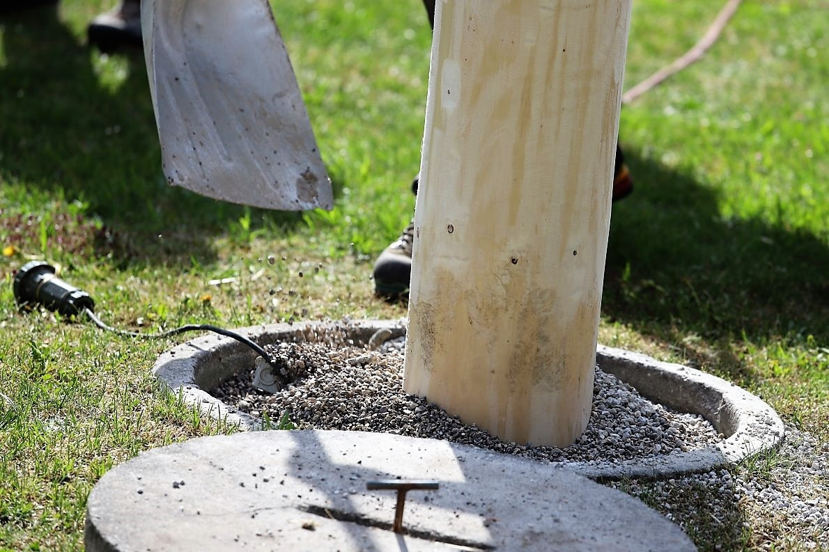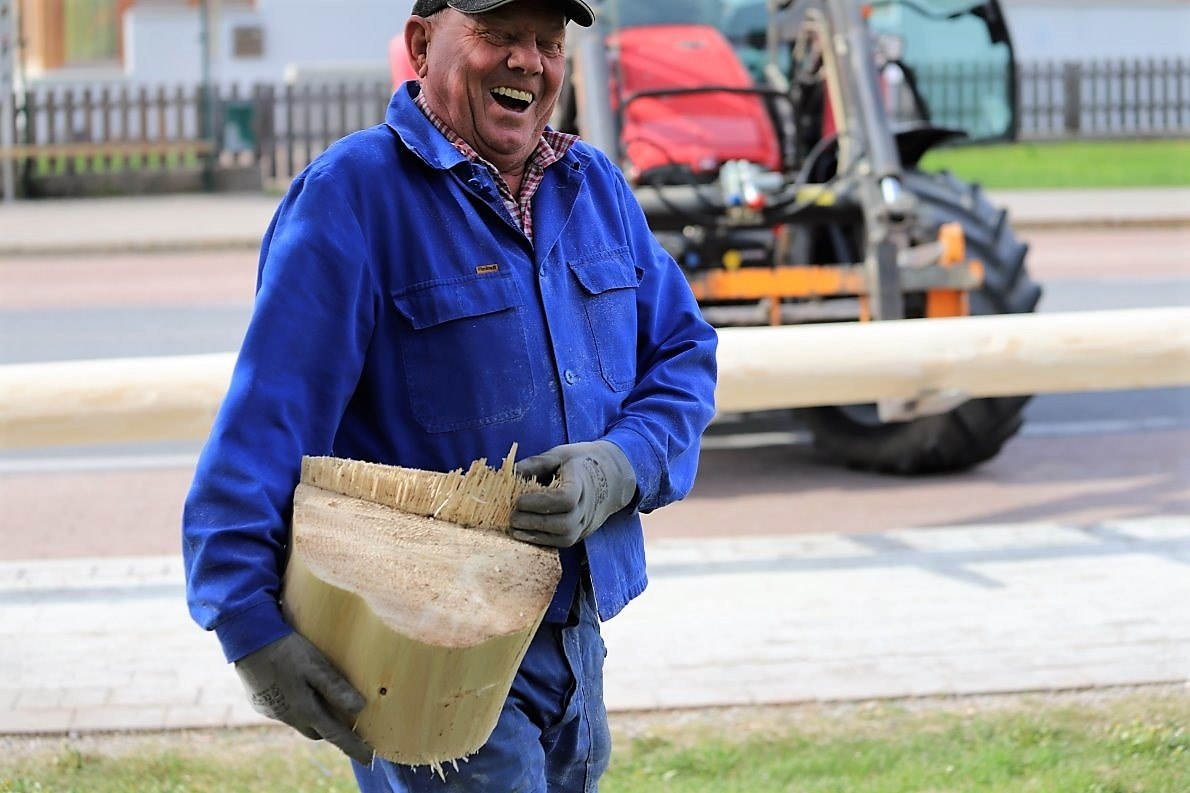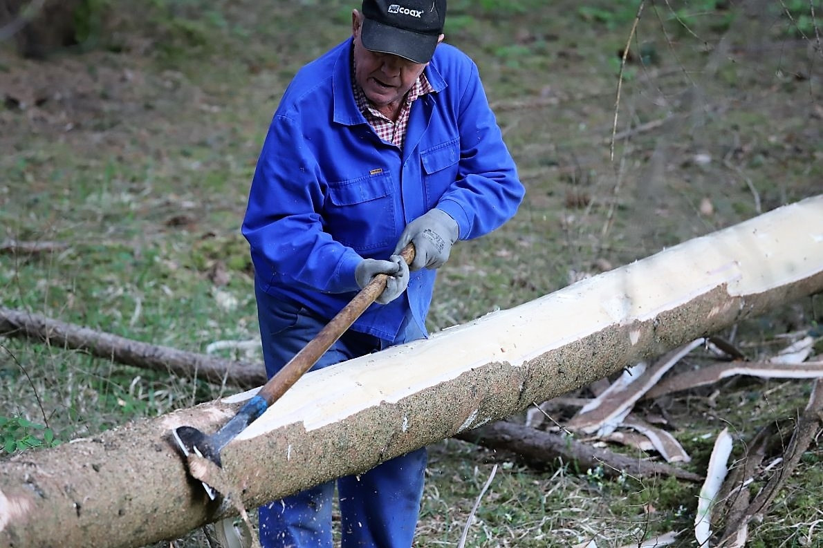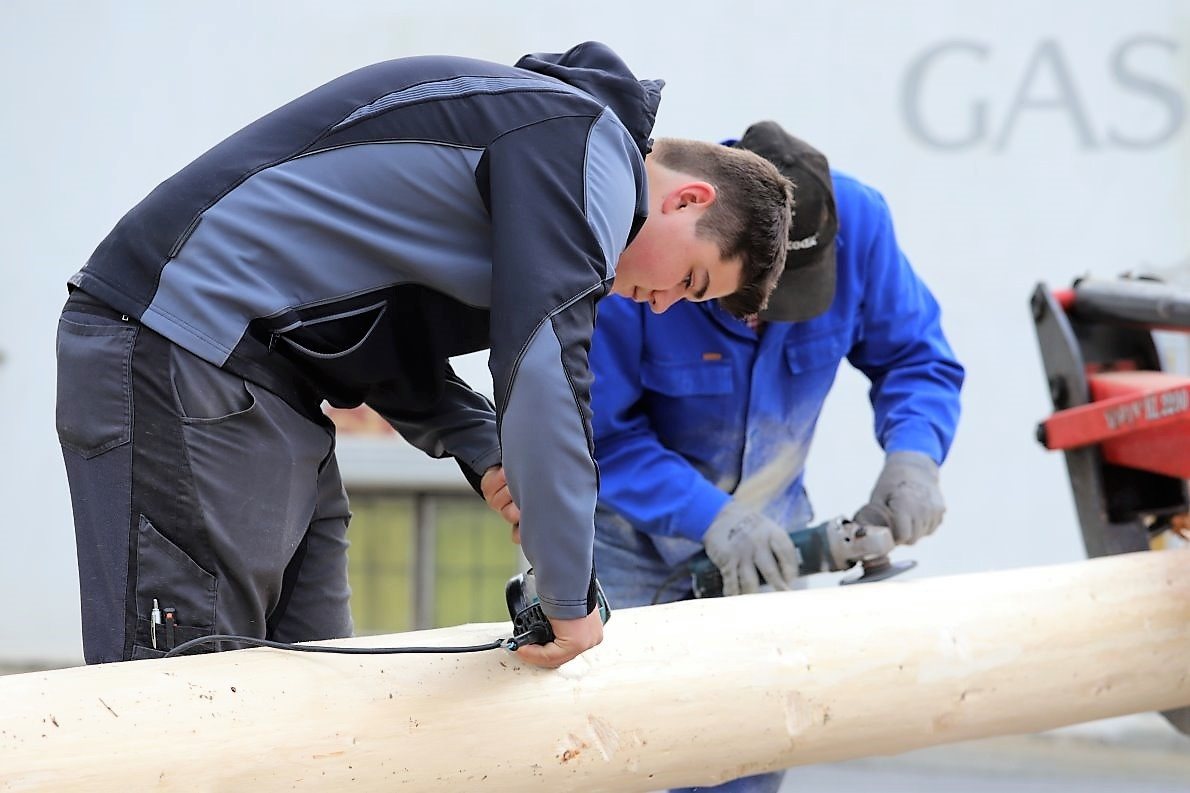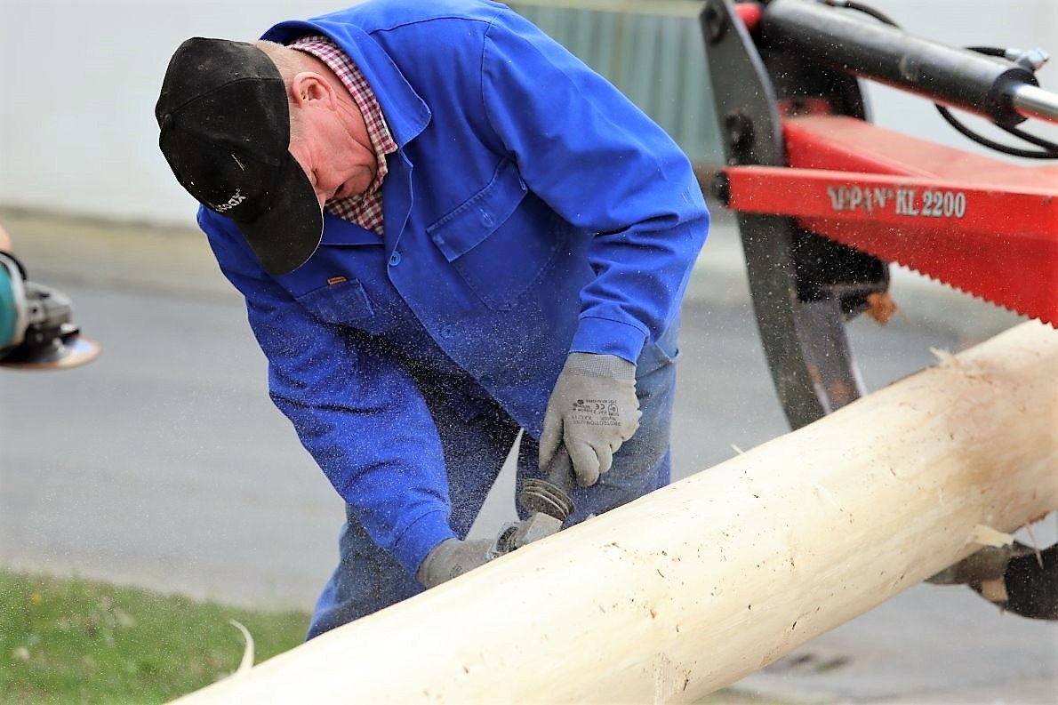 Auf die Baumfäller-Crew wartet vor der Kirche schon der Reindl Herbert. Ein Maibaum-Experte mit jahrzehntelanger Erfahrung. Er macht den „Stamm schön“. Dazu braucht der Herbert eine Schleifmaschine und noch ein paar helfende Hände. „Richtig glatt muss er sein“, sagt er. „Damit sich die Baumkraxler nicht verletzten.“