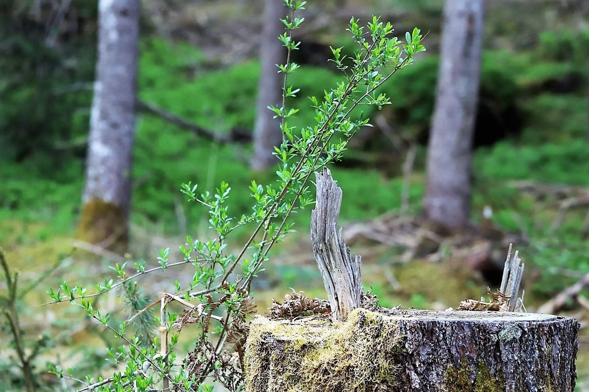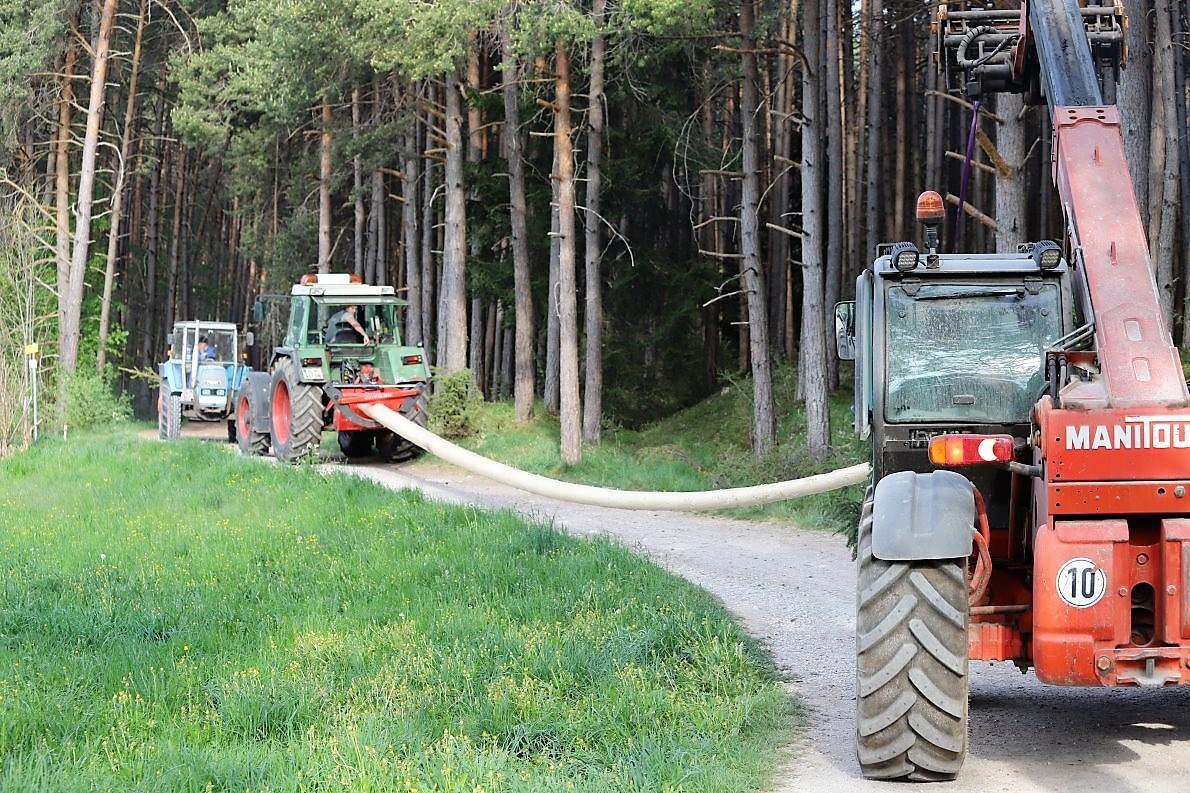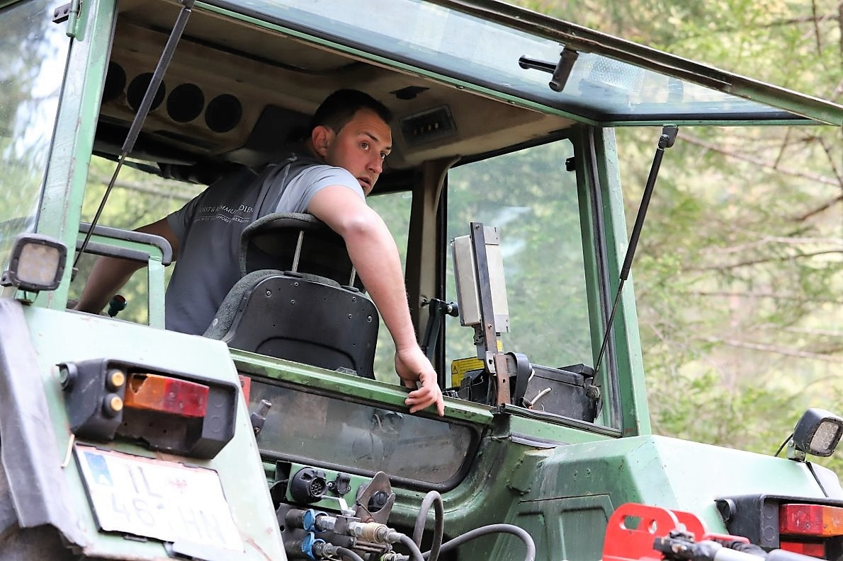 Ich darf aufsitzen und werde zur Stelle gefahren, die der Karl scherzhaft den „Maibaum-Bichl“ nennt. „Hier haben wir immer schon den ein oder anderen Maibaum gefunden. Die Stelle ist ideal. Weil die Bäume viel Licht haben, wachsen sie kerzengerade in den Himmel.“
