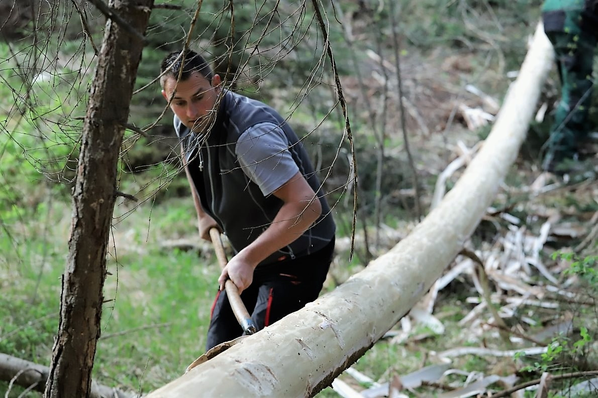Stefan Zimmermann und Karl „Charly“ Wett verstärken das Holzfäller-Team. Beides gestandene Waldbauern. Charly und Stefan bereiten den Abtransport des Maibaums nach Barwies vor.