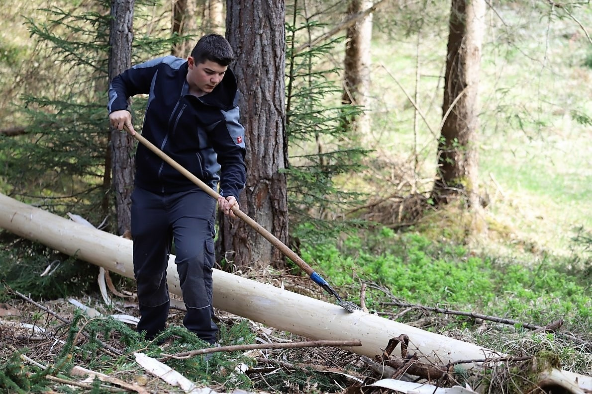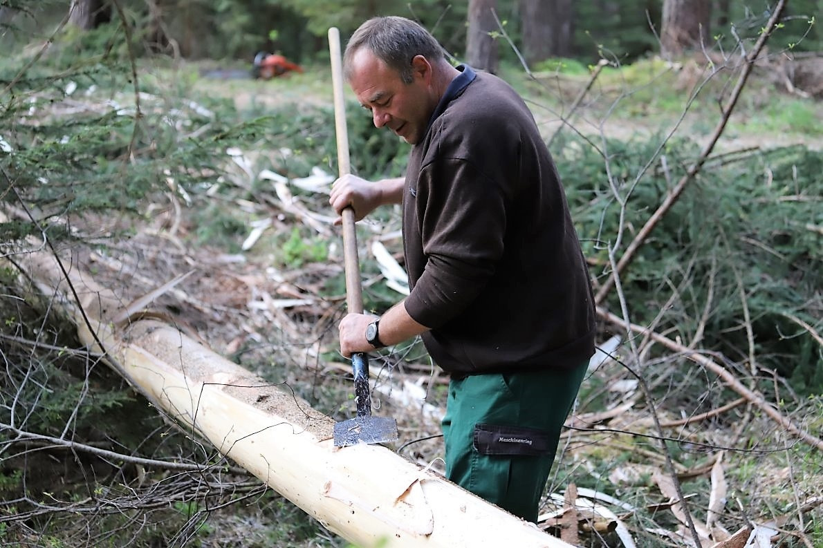 Der auserlesene Baum, eine ca. 150 Jahre alte Fichte, stand noch kurz vor seiner Beförderung zum Maibaum in einem Waldstück der Agrargemeinschaft Barwies. Benedikt van Staa hat den gerade gewachsenen Baum vor dem Aufstellen gemessen. „Der ist 26 Meter lang“, lässt er anschließend alle wissen.
