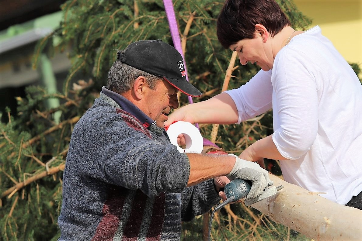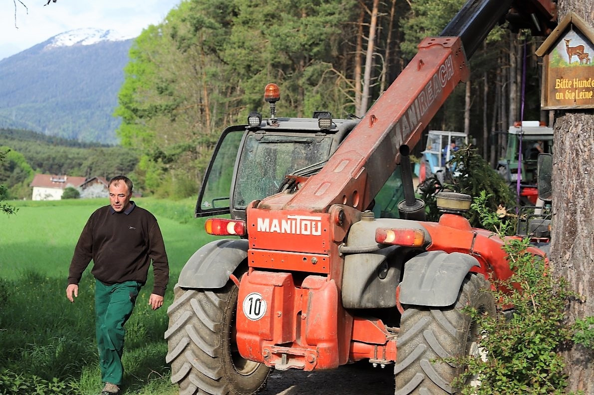 Benedikt van Staa mit Beni Junior treffen ein. Der langjährige Mieminger Ortsbauer schaut sich als Erster den Baum an und nickt zufrieden. „Gut gemacht, Manda!“