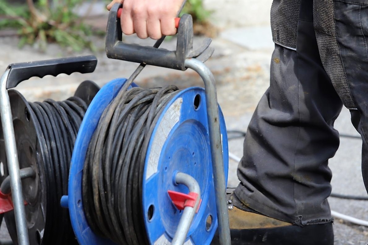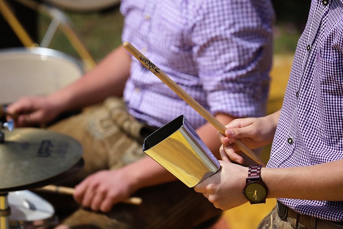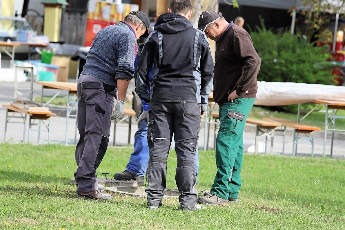 Die “Stiegl-Buam” mit Markus Kranebitter machten ab 11 Uhr den Anfang. Die beiden Musiker bauen ihre Instrumente, Verstärker und Lautsprecher-Boxen auf. Dann ihre Kollegen, mit denen sie beim Maifest für Unterhaltung sorgen sollen. Eine Premiere wird das, für die „5er Musig“ – einer Blasmusik-Formation aus Wildermieming und Mieming.