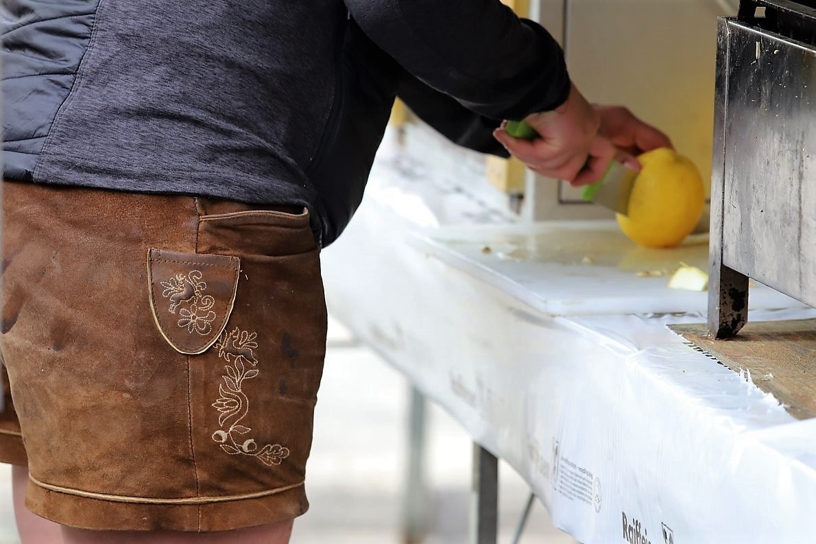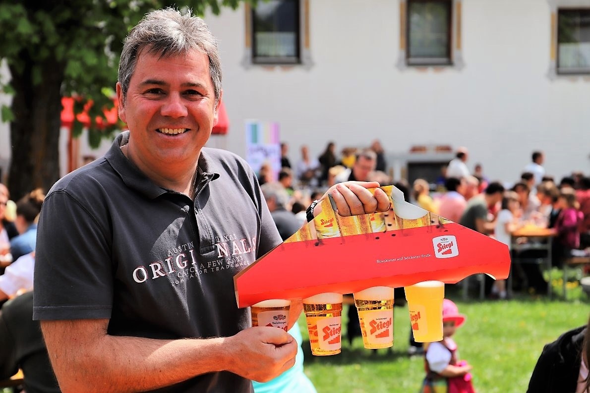 Das erweiterte Team der Jungbauernschaft / Landjugend Mieming richtet die Imbiss-Standl ein, das Team um Theresa Wallnöfer kümmert sich um den Bierstand. Punkt 9 Uhr wird das erste Stiegl serviert.