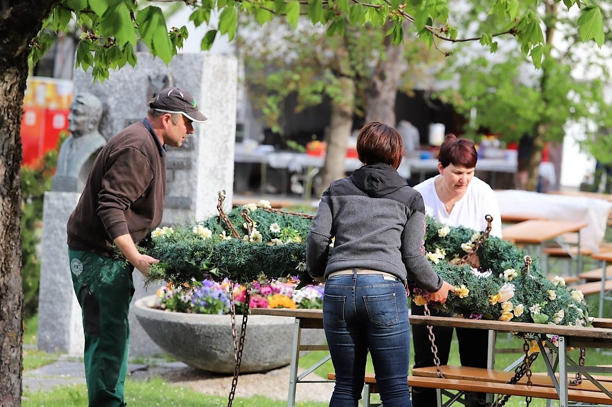 Der Eduard-Wallnöfer-Platz in Barwies lebt auf. Im Minutentakt treffen alle ein, die das Maifest mit vorbereiten. Die Mieminger Bäuerinnen um Daniela Kapeller (rechts im Bild) bringen den ersten Kuchen. Von der Bergrettung Mieming treffen Romana Mair und Johannes Klein ein. Sie organisieren vorab die technische Umsetzung der Sicherungen für das spätere Maibaumkraxeln.
