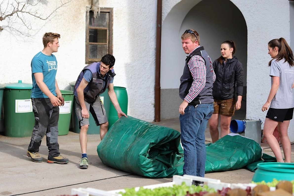 Die Jungbauern um Obmann Elias Kapeller helfen wo es nötig ist. Beim Aufstellen der Marktstandln, bei der Platzgestaltung und beim Aufrichten der Hüpfburg, hinter dem Stall der Familie Wallnöfer.