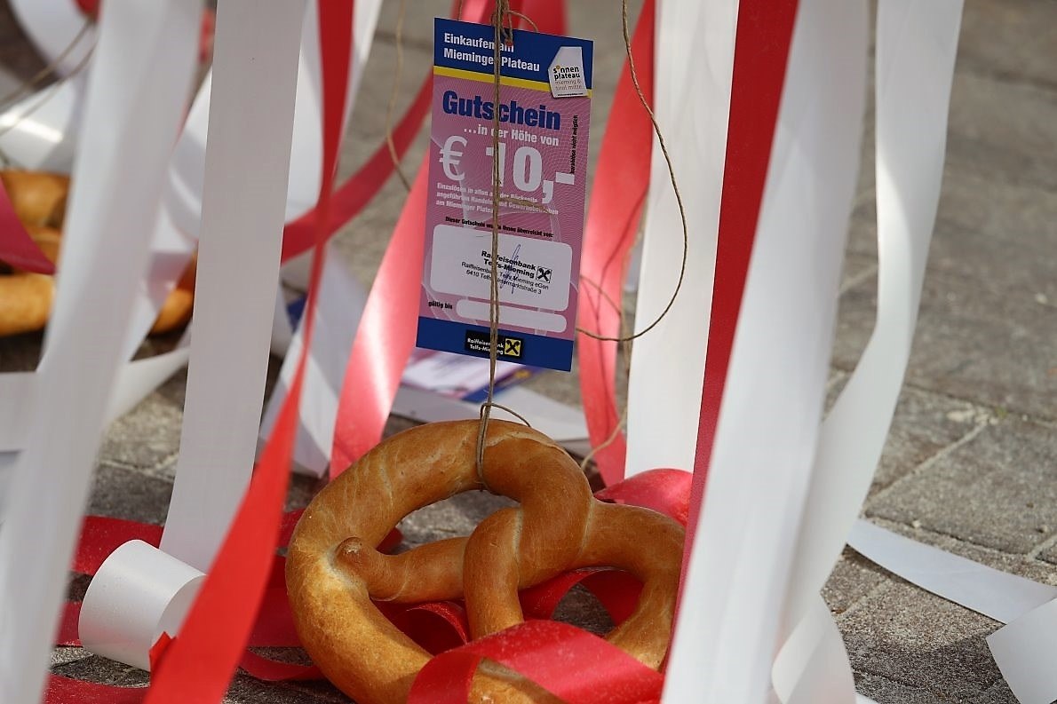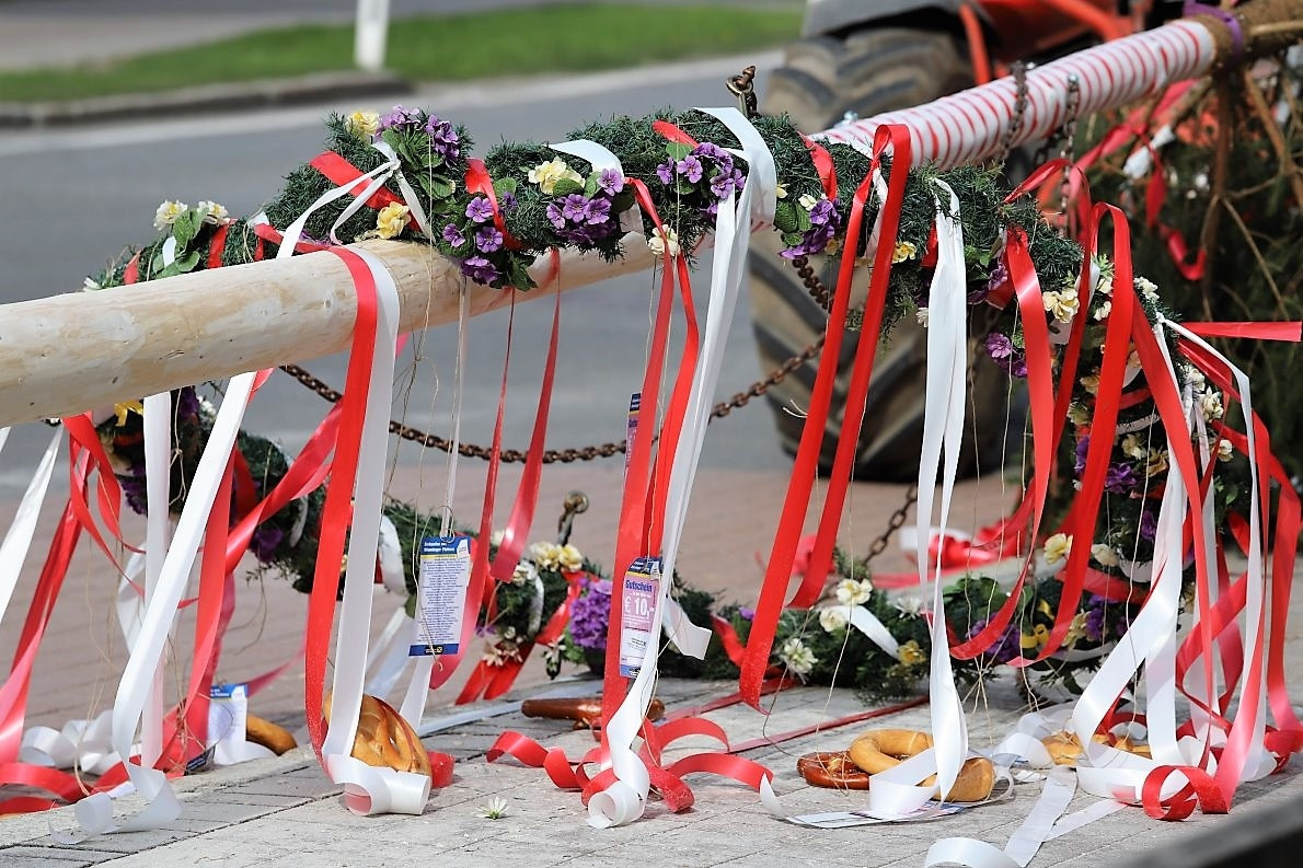 Die Baumkrone wird mit roten und weißen Schleifen geschmückt. Maibäume in den Landesfarben haben in Tirol eine lange Tradition. Zur Belohnung erfolgreicher Maibaumkraxler werden große Brezn mit Geldgutscheinen der Raika angehängt.