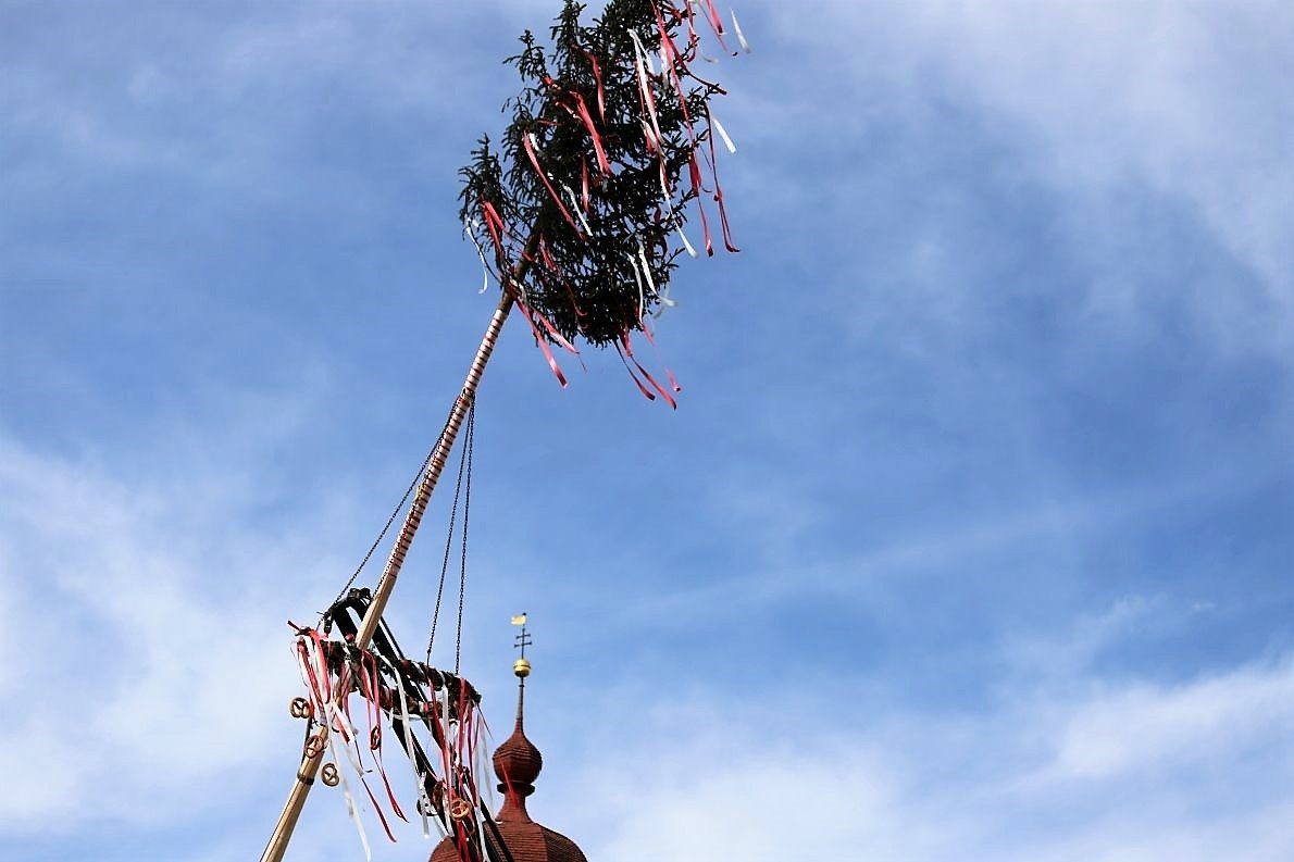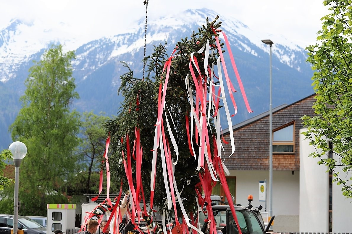 Das Baumaufstellen geht so schnell wie alles andere zuvor. Die Uhr am Kirchturm der Pfarrkirche zeigt an, es ist inzwischen 8.45 Uhr. Der Maibaum steht. Vor der Kulisse der Mieminger Berge und dem fast wolkenlosen blauen Himmel, eine wahrlich stattliche Erscheinung.